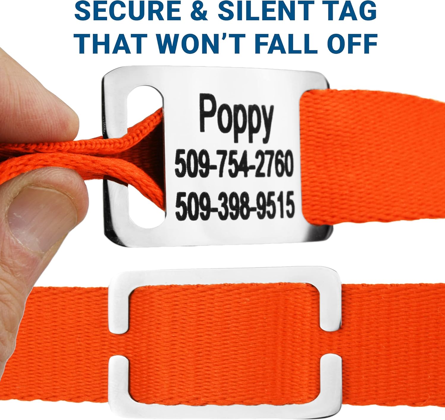 GoTags Personalized Dog Collar with Nameplate, Adjustable Dog Collar with Custom Engraved Slide On Pet ID Tag in Stainless Steel, Silent, No Noise Dog Tag for Large Medium and Small (Orange, X-Small)