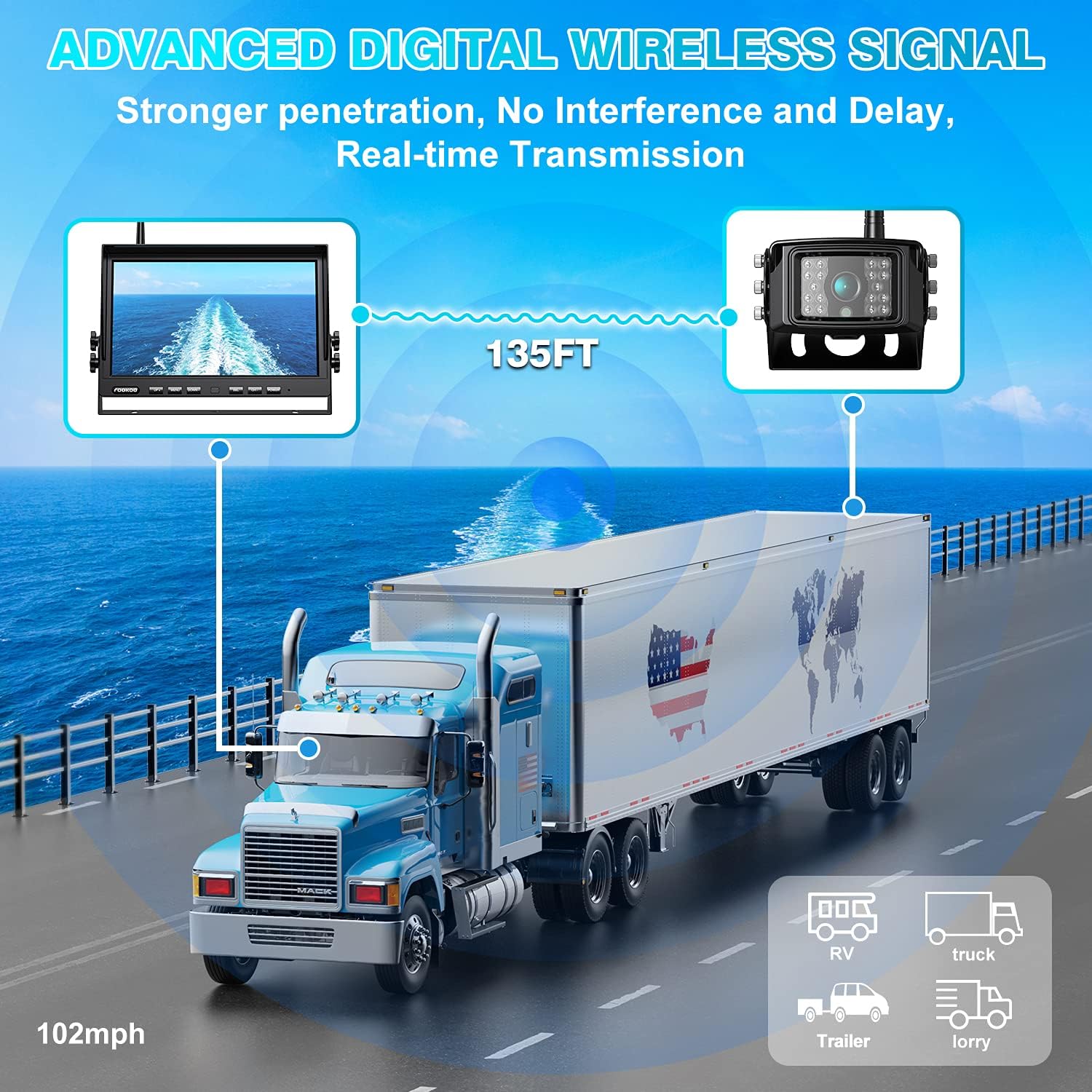• 【Advanced Digital Wireless Signal】The system with stable digital signal works flawlessly within 128ft range in open area, enough for any large vehicles. Even at the high speed of 102 mph, the monitor will display the surroundings in real time, making your driving more convenient. There is no interference, flicker, blurring or delay.