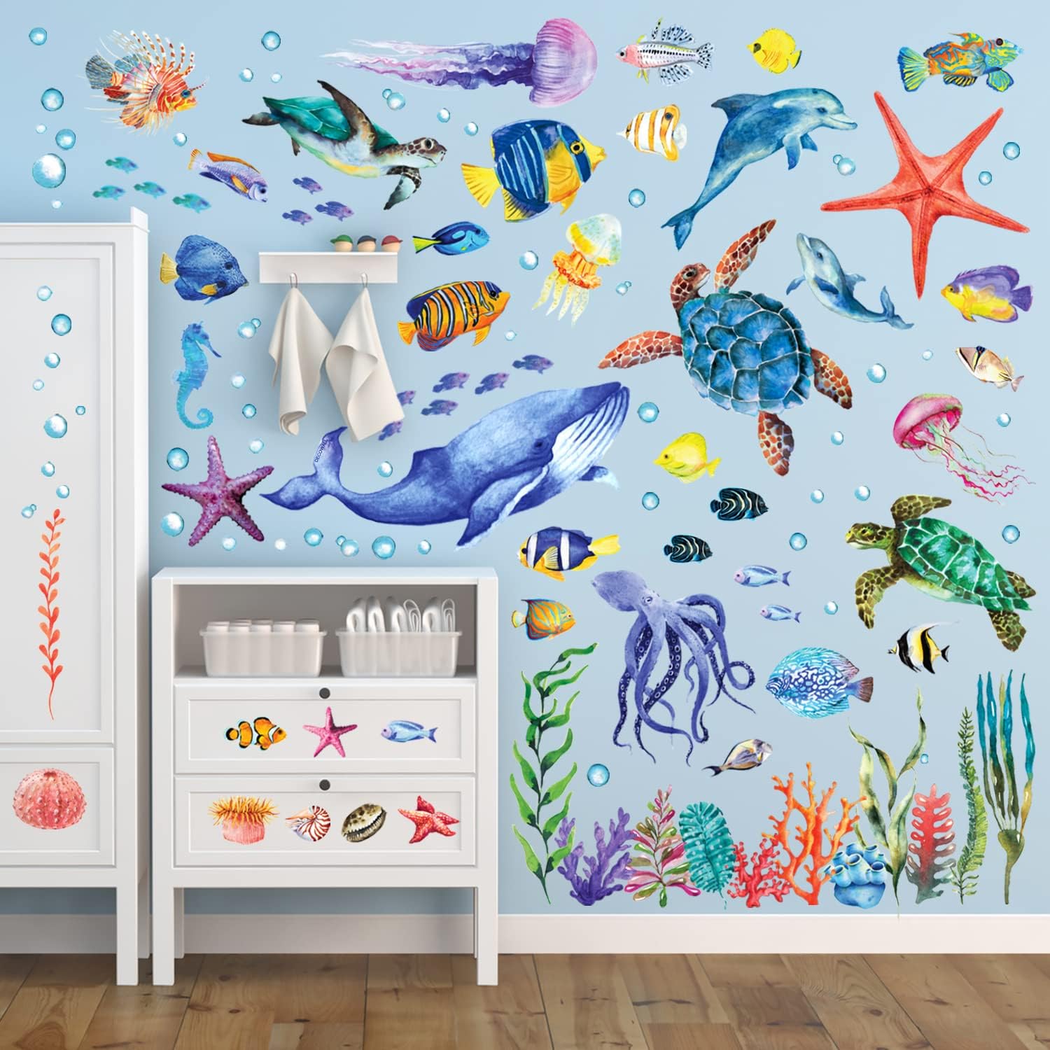 BASHOM DS12-8048 128 Pieces Under The Sea Wall Decals Ocean Fish Stickers Turtle Jellyfish Seaweed Removable for Kids Bedroom Nursery Living Room Home Art Decor Bathroom Baby