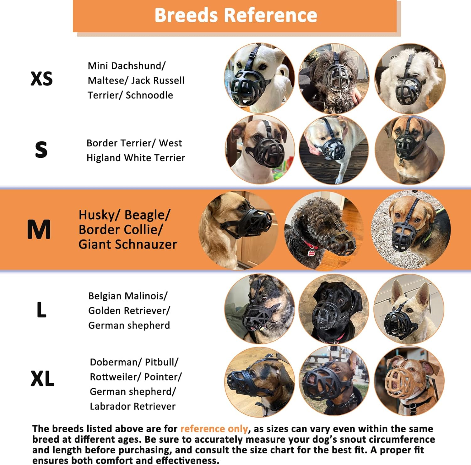 • Perfect Fit for Medium Sized Dog: This option Size M basket muzzle is ideal for medium breeds like Husky and Beagle. The breeds listed above are for REFERENCE only. Be sure to measure your dog’s snout circumference and length accurately before purchasing, and refer to the size chart. A proper fit ensures comfort and effectiveness