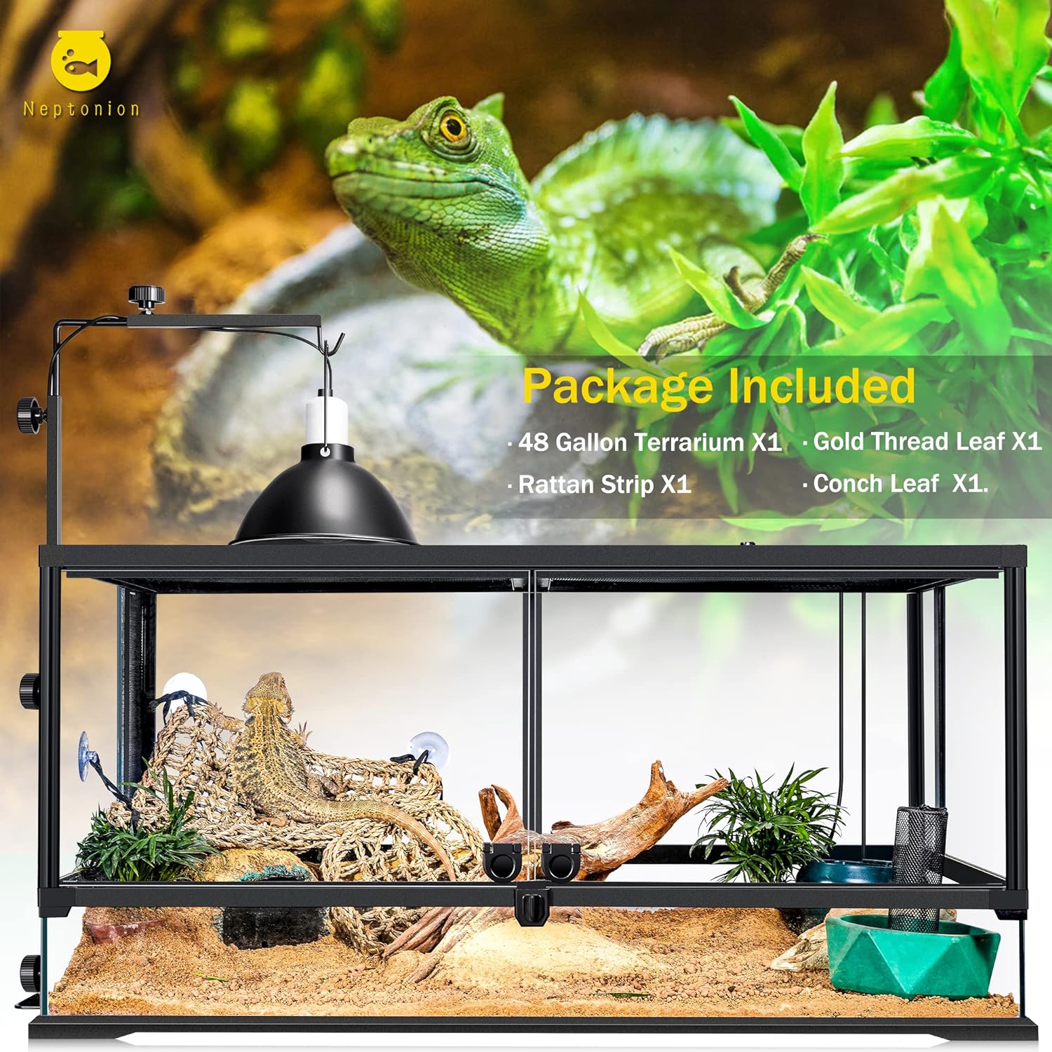 - - Package Included:48 gallon terrarium, a rattan strip, a gold thread leaf , a conch leaf.