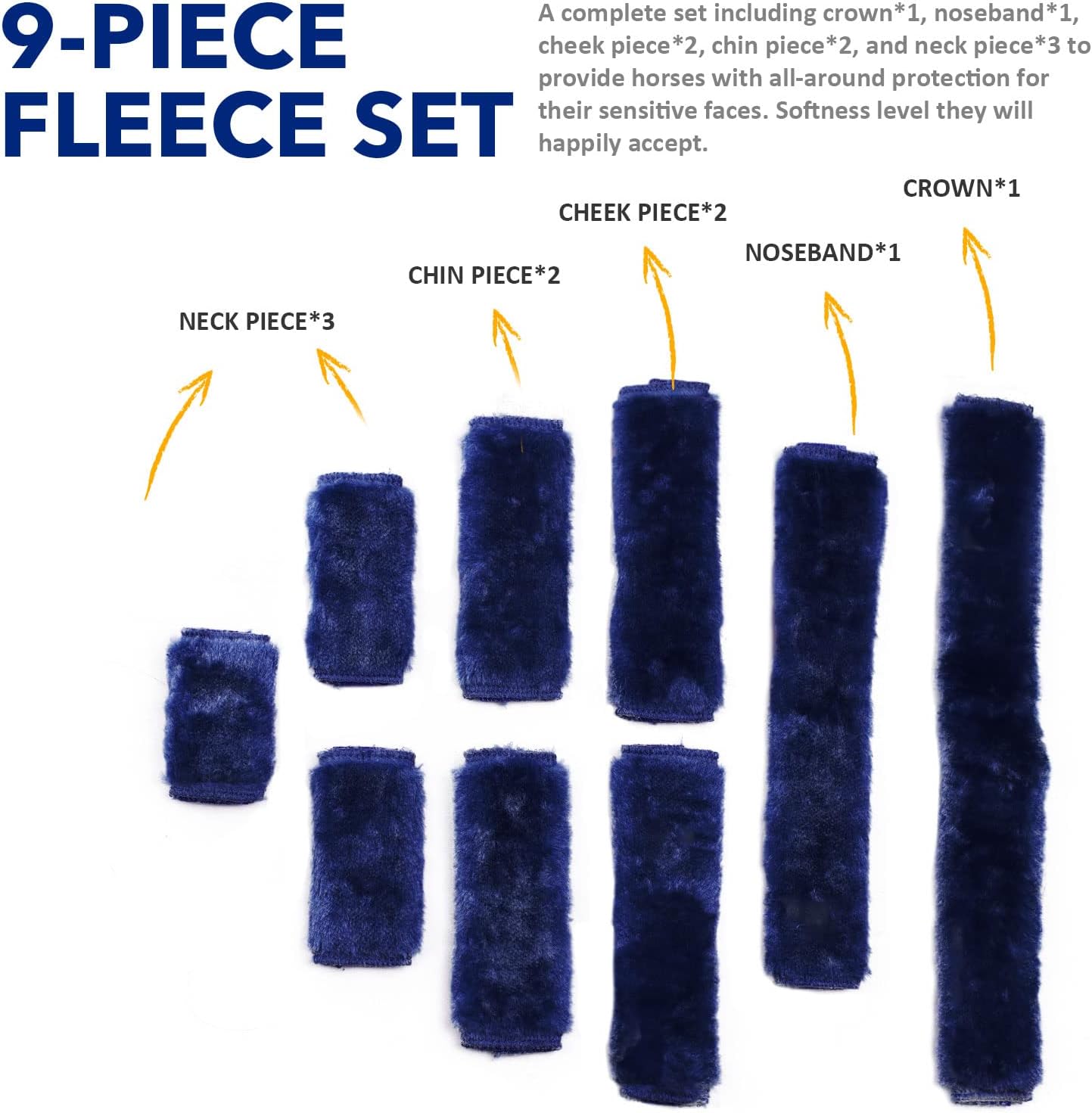 - 9-PIECE FLEECE SET: A complete set including crown*1, noseband*1, cheek piece*2, chin piece*2, and neck piece*3 to provide horses with all-around protection for their sensitive faces. Softness level they will happily accept. Equip your horse with this set and he is rub-free!