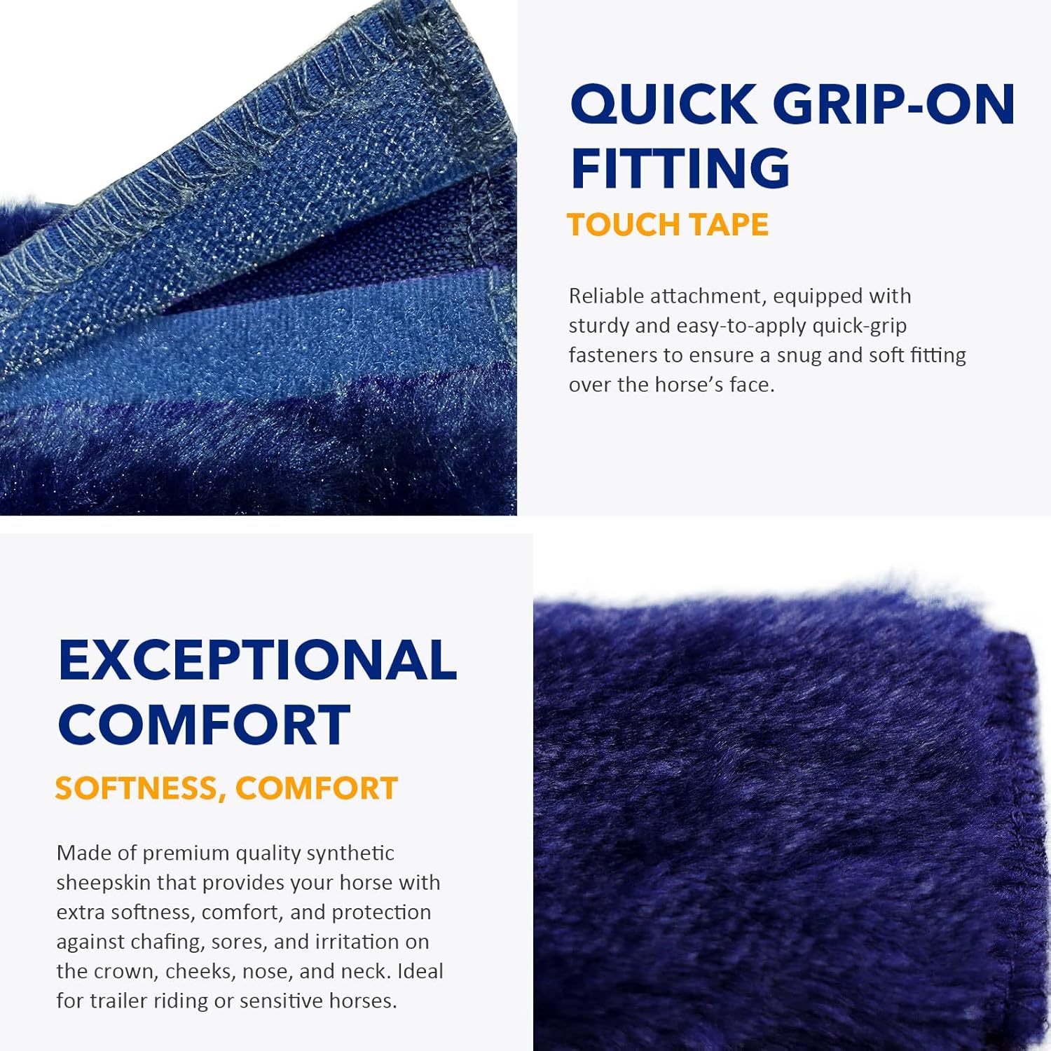 - QUICK GRIP-ON FITTING: Reliable attachment, equipped with sturdy and easy-to-apply quick-grip fasteners to ensure a snug and soft fitting over the horse’s face.