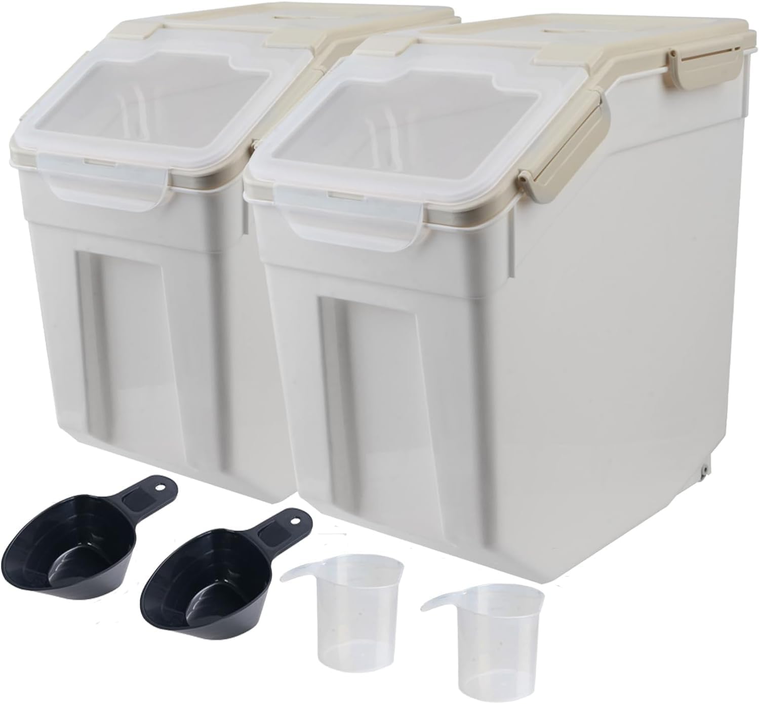 AnRui Airtight Flour Storage Container 25lb, Plastic Grain Storage Bucket, Rice Cereal Dispenser Organizer Box with Lid, Cat Dog Food Storage Bin with Measuring Cup, Scoop, Wheels, 2Pcs Grey