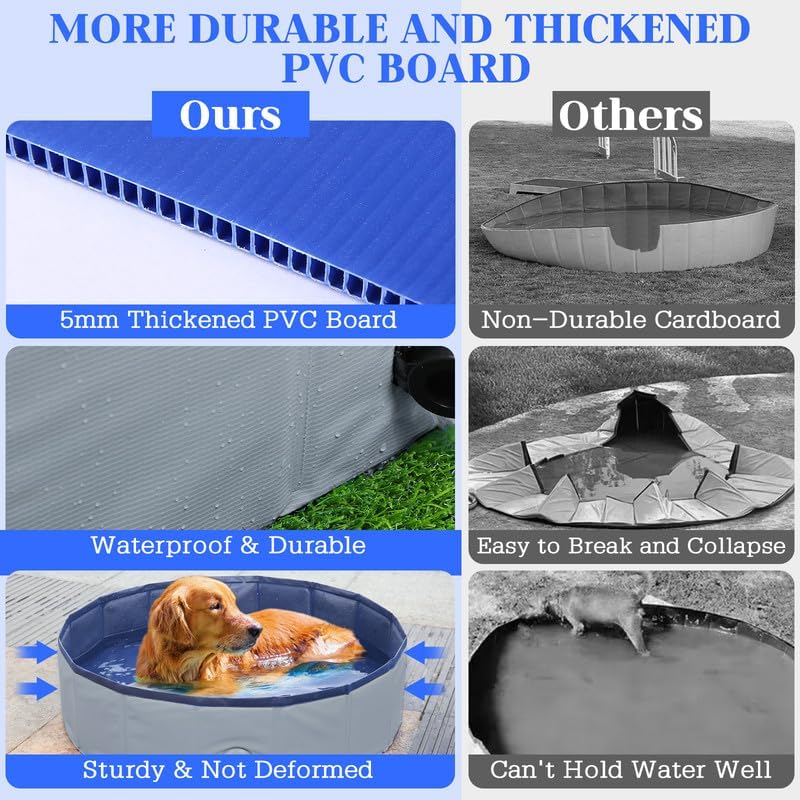 - 【High-quality Material, Sturdy Durable】 - The dog pool / kids pool is made of high-density fiberboard and high-quality PVC material. Strong enough and uneasy to collapse and deform. The bottom is made of abrasion resistant non-slip textured fabric, non-toxic and waterproof, perfect water retention. It also can prevent your pets from slipping when they jump around in the bath pool. Tips: Please trim your puppy's nails to prevent damage or leakage to the inner wall.