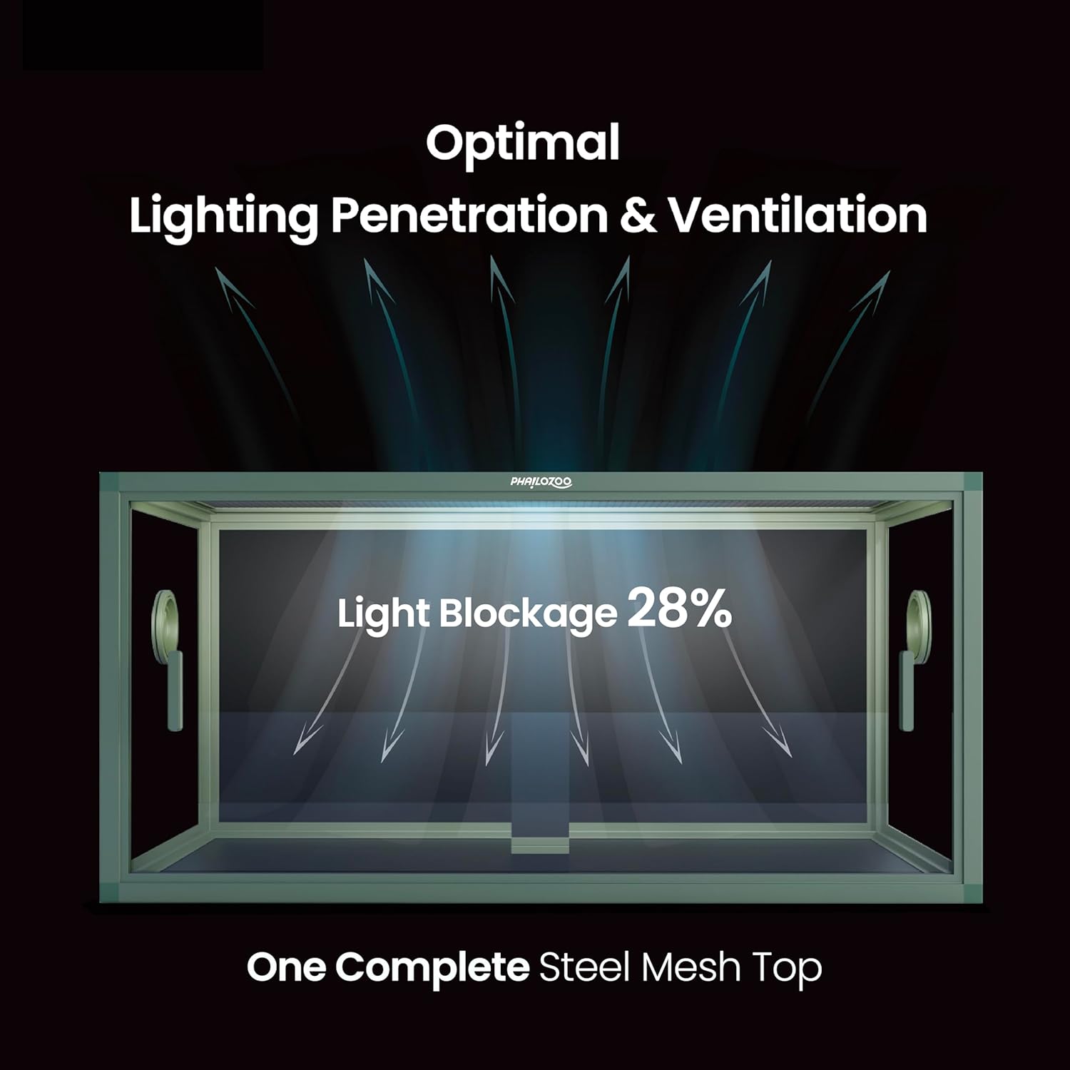 - ăHighly AdaptiveăWell-lit screen top with only 28% blockage. Compatible with many reptile accessories and equipment, such as heat lamps for reptiles, reptile humidifiers, reptile misters, reptile foggers, reptile UVA and UVB. Our reptile terrarium is great for holding temps and humidity.