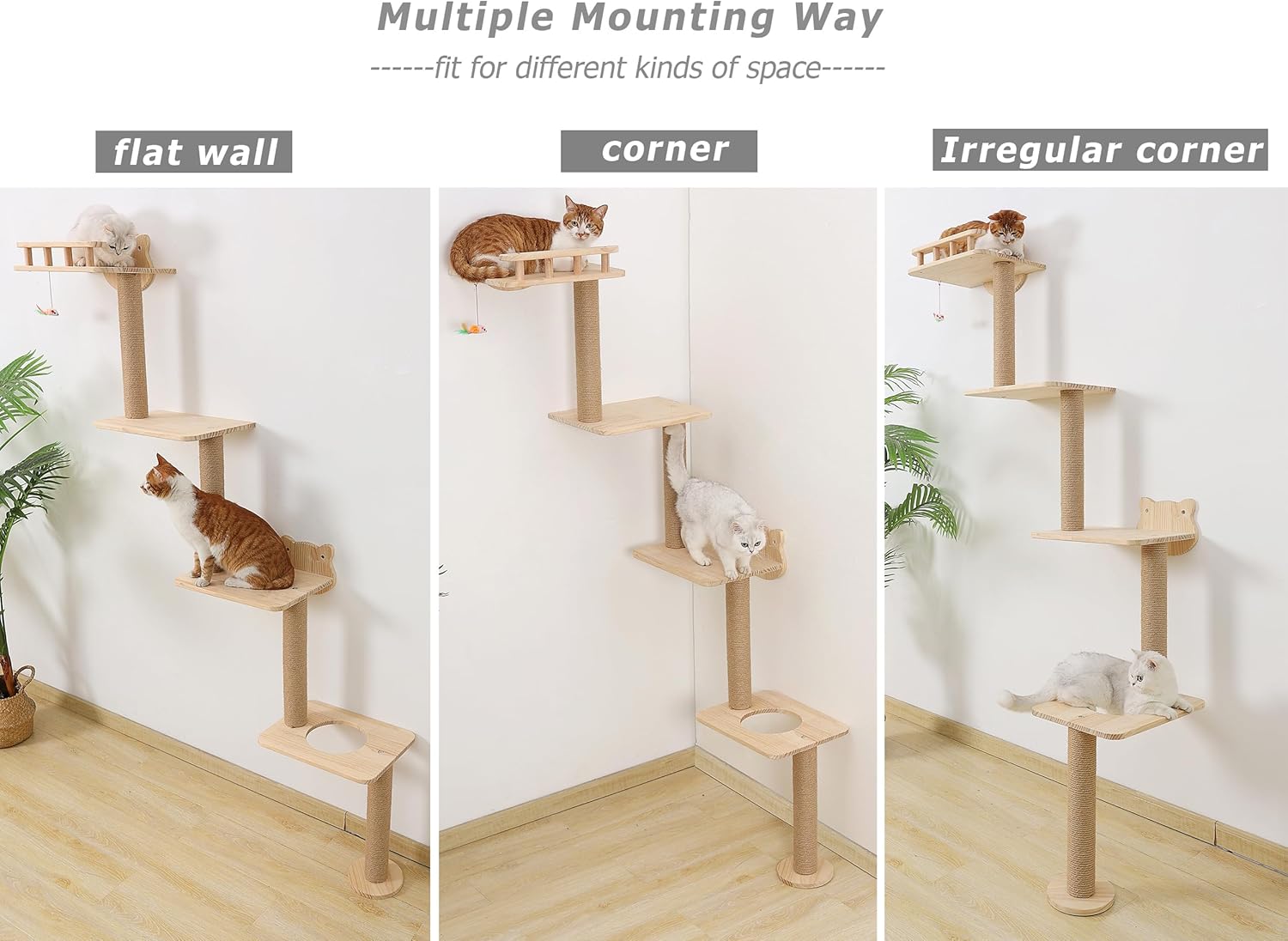 - 2.Great Space Saving Idea: The wall cat tree can be mounted in differnt ways, fit for flat walls or any irregular corners.The corner cat tree is an excellent solution for smaller homes, allowing your cat to enjoy their own vertical territory without taking up valuable floor space.