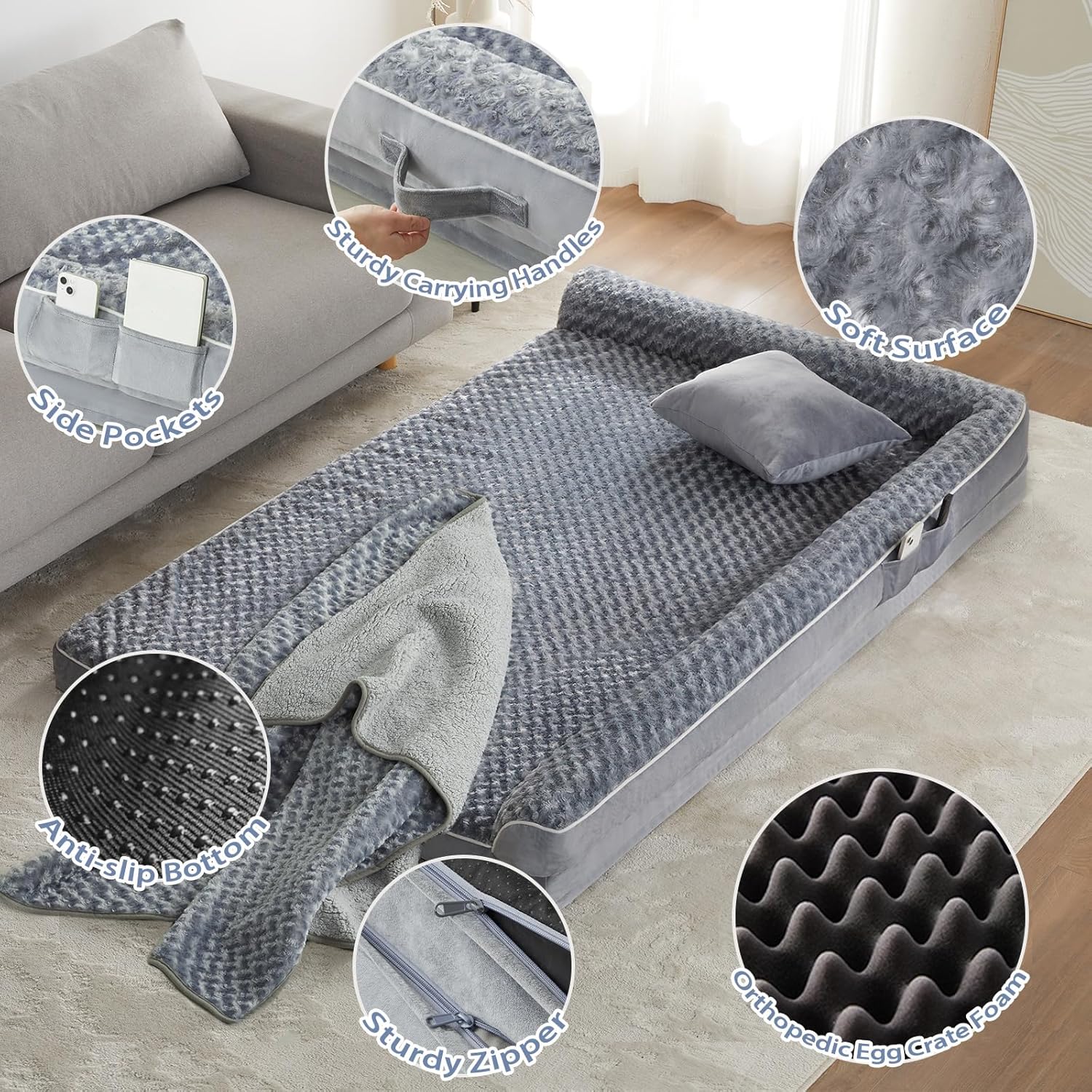 - EASY TO CLEAN&NON-SLIP: The sofa dog bed comes with a removable and washable dog pillow cover to ensure that the big dog bed can be easily cleaned. The washable dog bed has a durable zipper that allows for easy removal and reattachment. The non-slip rubber particles of the waterproof dog bed bottom hold it in place on the floor without sliding.