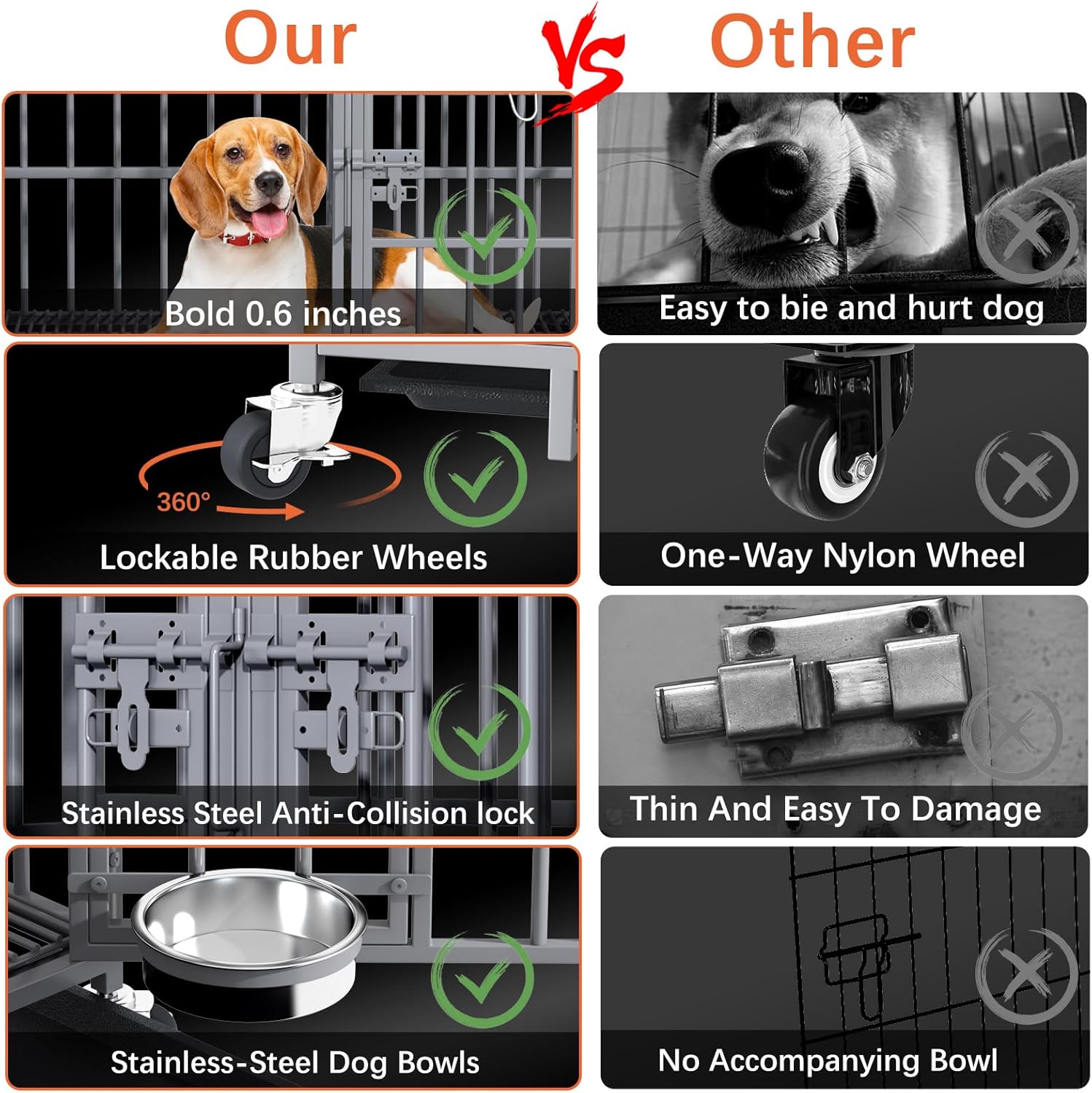 - ăSpace Saving & StackingăThis dog crate can be folded into a compact size and can be stored in a narrow place when not in use. It also has a stackable function, if you buy multiple heavy duty dog crates, you can stack them to make a dog condo. Help you save more space. This stackable dog crate it helps to maximize the use of space.