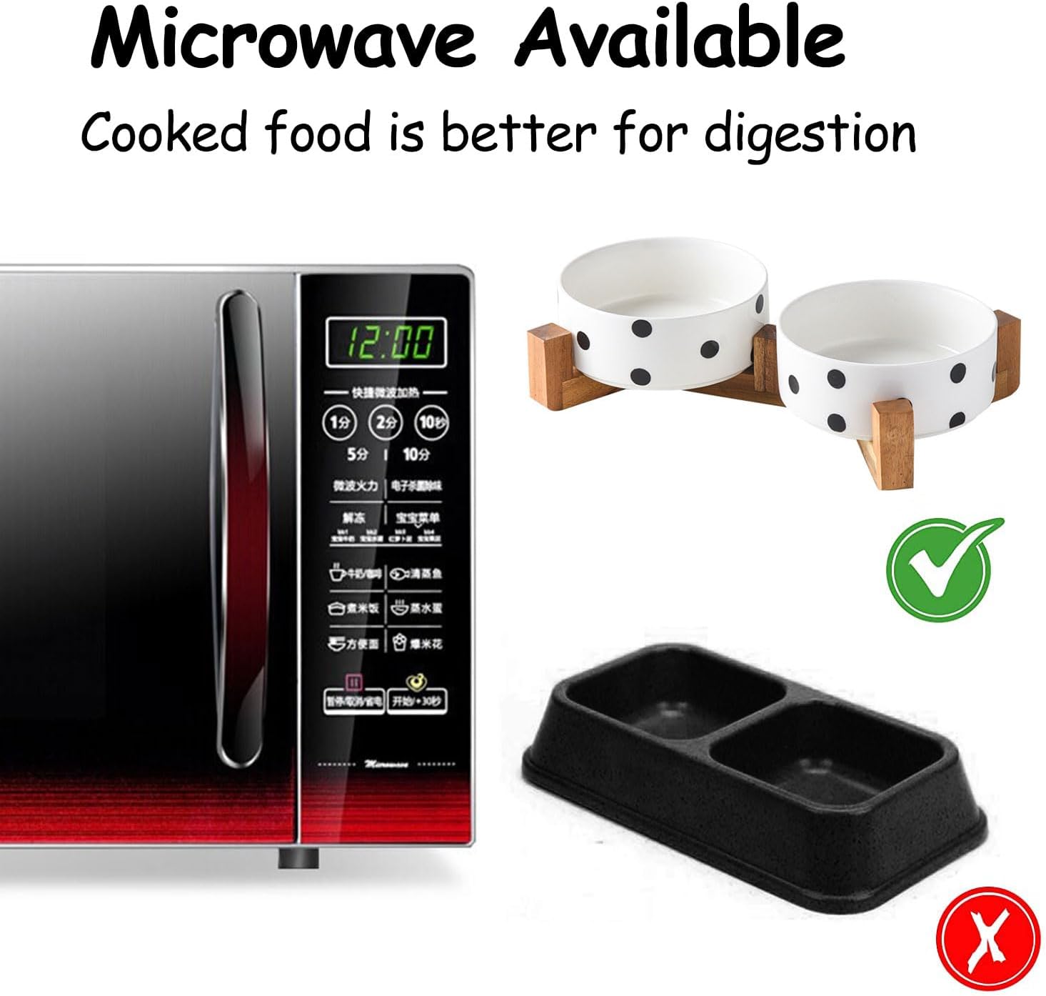 - EASY TO CLEAN CERAMIC - This easy clean dog bowl set is dishwasher proof, as well as easy to handwash and wipe down. With thick walls, these ceramic bowls for pets are sturdy, weighty yet not too heavy. Double Bowl Design:One dog bowl for food and one for water, Each ceramic cat bowl has a Unique wooden stand, raising the dishes closer to your pet for more comfortable eating