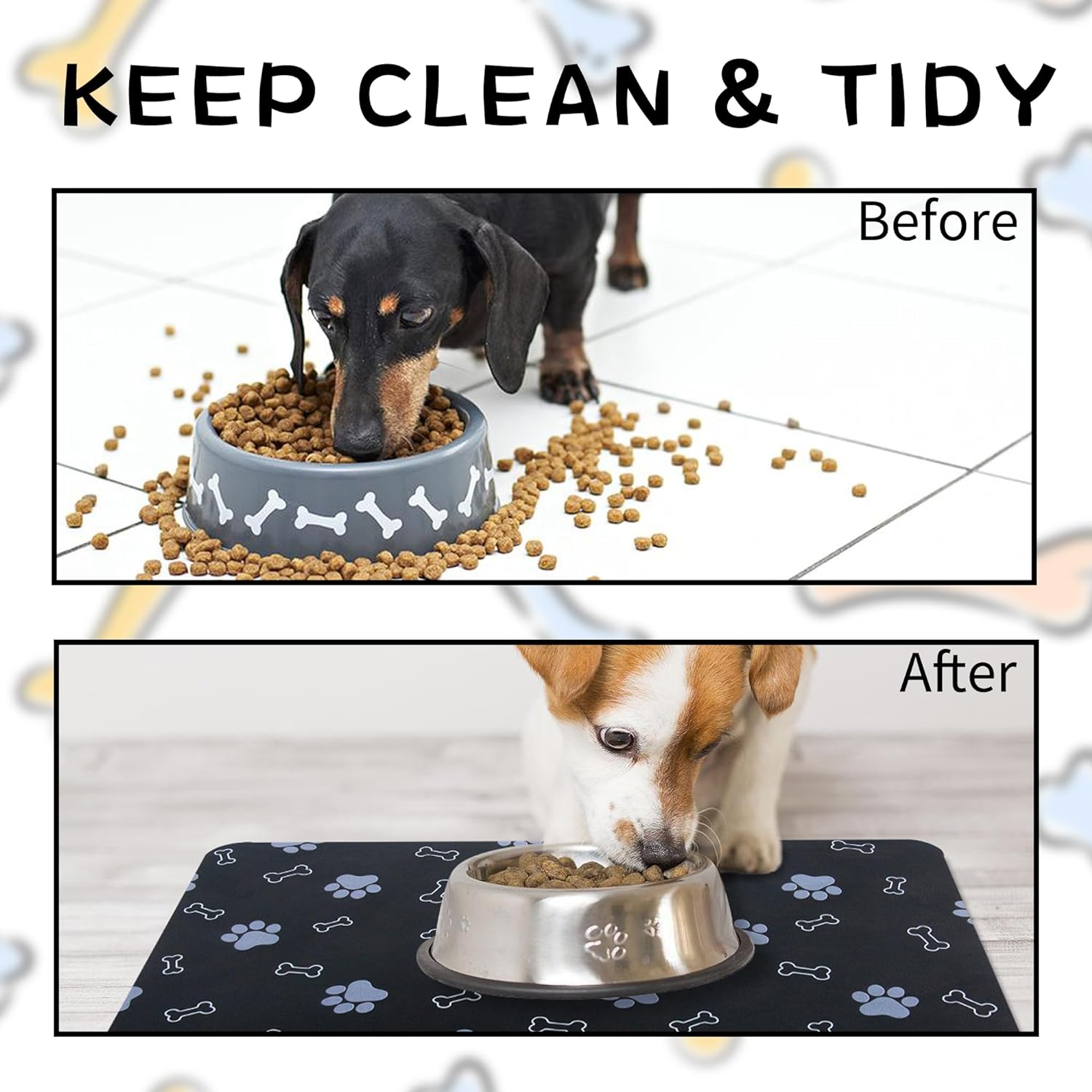 - 【Anti-Slip】The non-slip rubber backing keeps the dog & cat feeding mat in place no matter how your pet pushes on it. The waterproof rubber bottom prevents water from penetrating the floor. Dog bowl mats for food and water will not cause the floor to be corroded and reduce the abrasion to the floor.