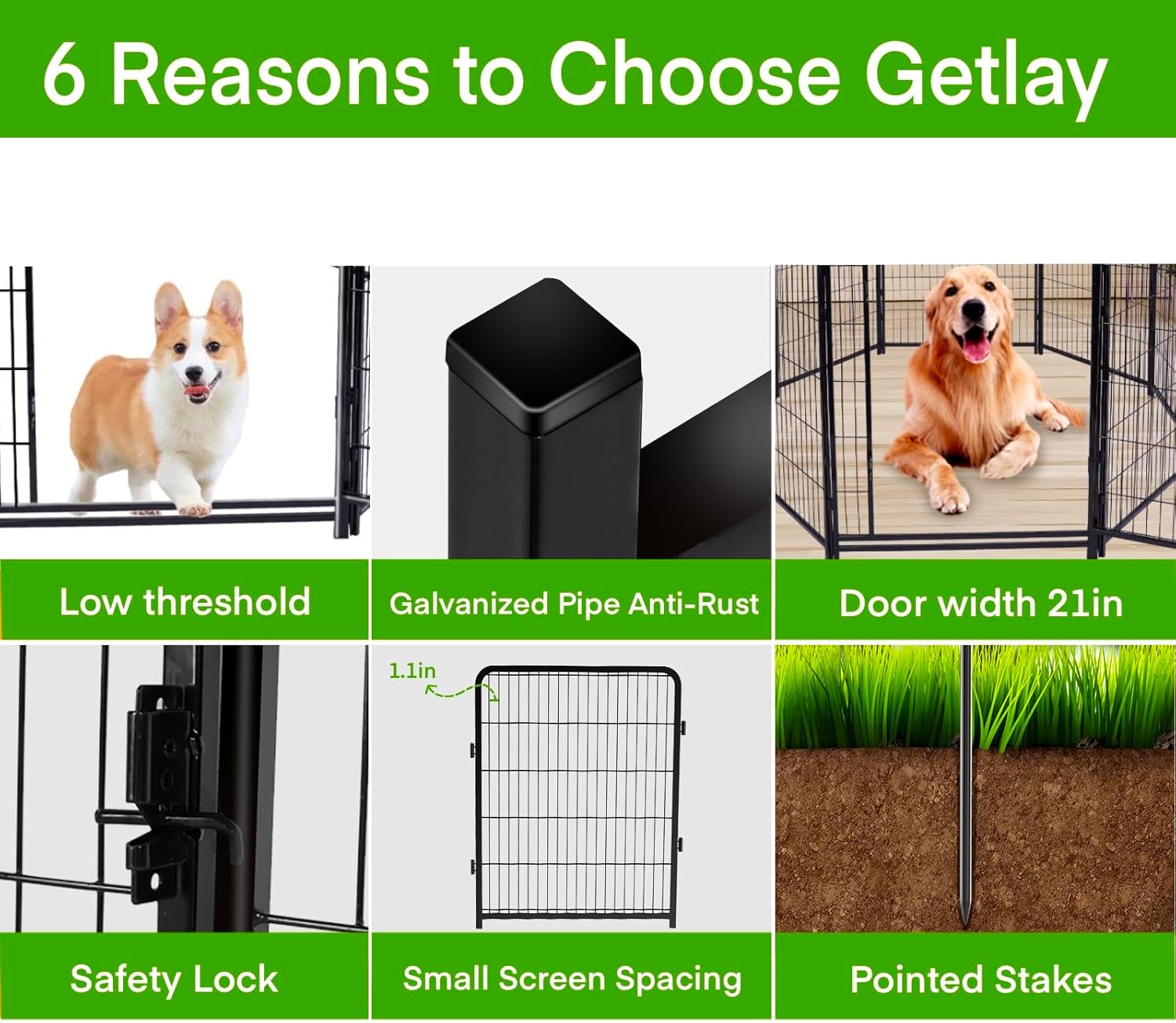 - Advantage 2: Getlay's garden dog fences is designed as a 21-inch-wide gate with no threshold, and anyone or animals can enter and exit freely. Unlike Other Fences with High Thresholds and Narrow Gates and Tripping. Super Easy to Assemble it Wonβt Take You More Than 10 Minutes to Assemble These Portable Dog Fences , Panels Can Be Added or Removed Freely to Give You a Fully Flexible Area and Arrange the Dog Pen in any Shape You Need