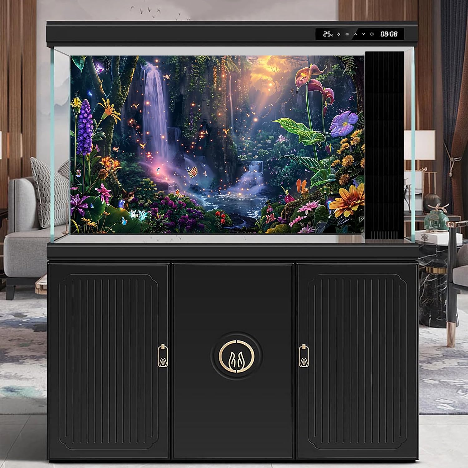Fantasy Garden Aquarium Background Sunset Waterfall and Flowers Terrarium Backdrop Tropical Forest Lush Plant Magic Butterfly Lights Flowers Fish Tank Background Poster Decorations 72x18in