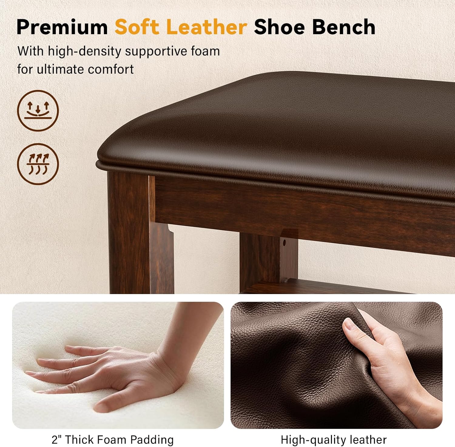 - ELEGANT RUBBERWOOD CONSTRUCTION & LUXURY LEATHER CUSHION: This shoe bench features a sturdy design that comfortably supports a person's weight, thanks to its solid wood construction. Itβs robust enough for multiple people to put on or take off their shoes at the door. The plush leather cushion creates a cozy spot for slipping on or removing shoes, with generous padding for a quick sit or a moment of relaxation.
