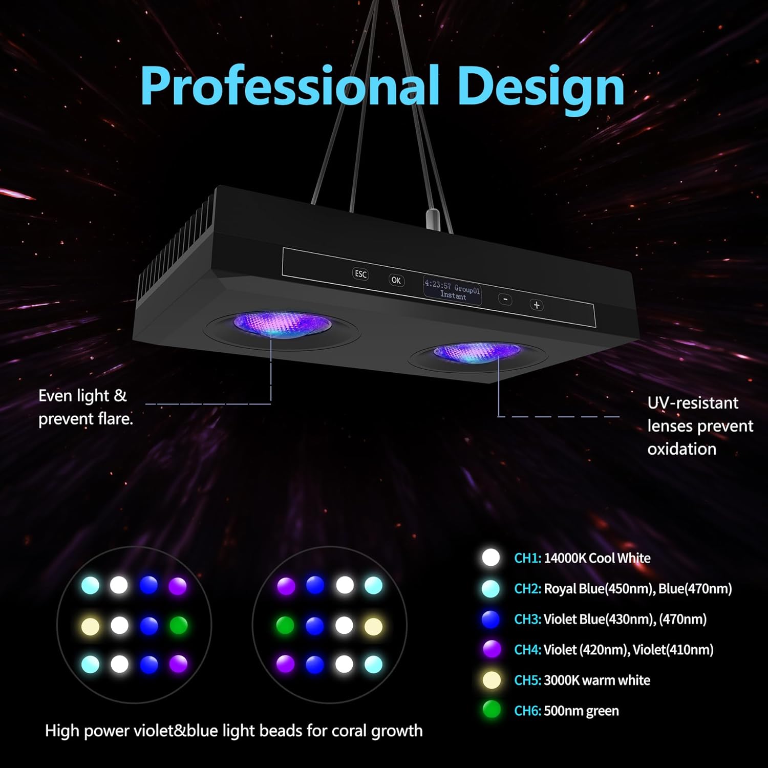 • BETTER HEAT DISSIPATION & NO NOISE -Smart two-rollers silent temperature control fans ensuring optimal LEDs' working conditions. Noise standards is lower than 44.7 db(A), fast heat transfer and create you a comfortable environment. G5 is very good coral lights for saltwater tanks
