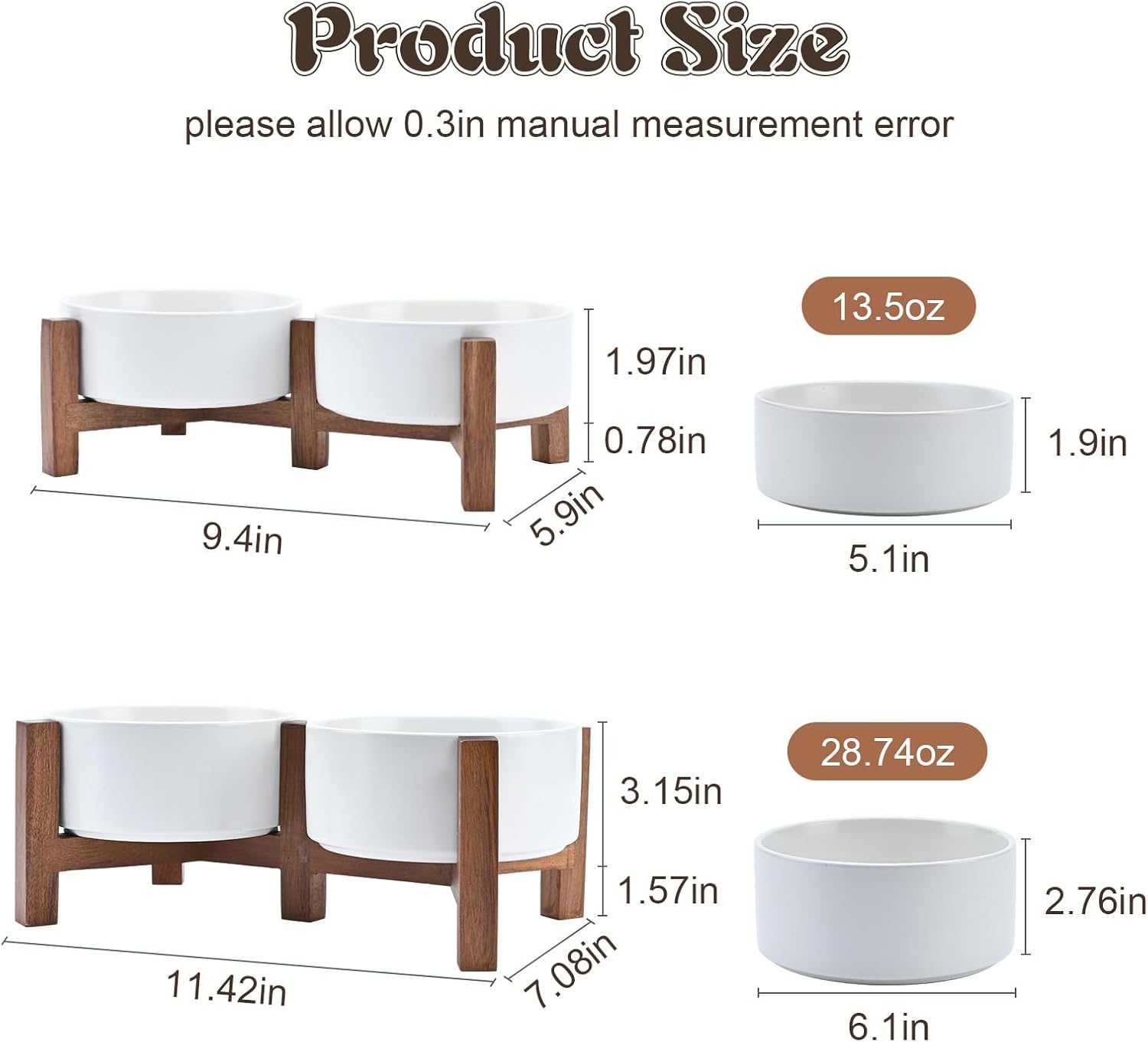 - UPGRADED ACACIA WOOD SHELF: Compared to the usual wood stand, this feeding bowl uses higher quality acacia wood, which not only enhances the overall stability and durability, but also the natural wood grain and warm tone of the wood stand can beautify the home space. The acacia wood stand has better durability and maintains a stable temperament even in humid environments