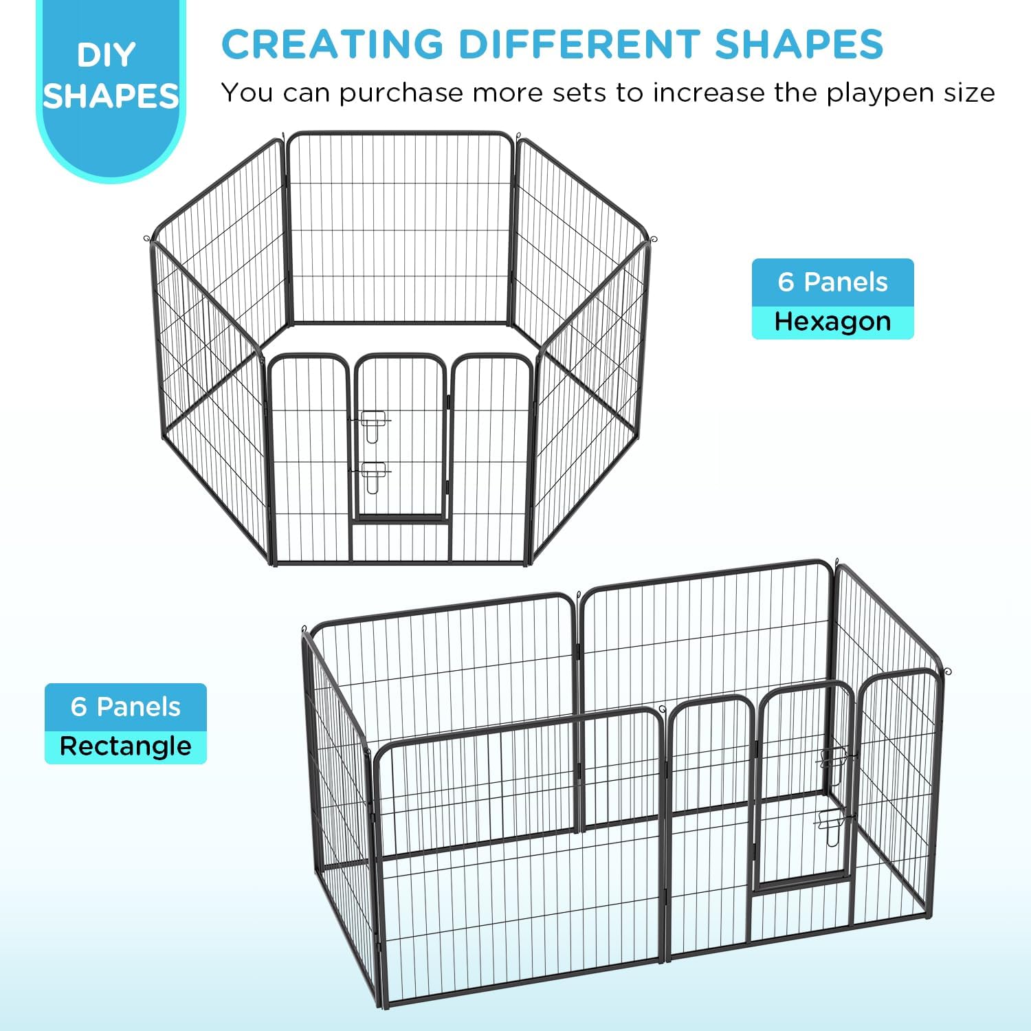 - EASY SETUP & CUSTOM CONFIGURATION: No tools are required. Shape this play pen into a square, rectangle, or octagon. Expand with panels to build a dog fence, large playpen, or dog run area.