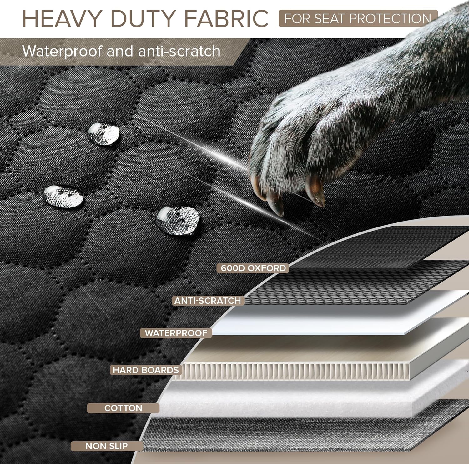 - HEAVY DUTY DOG CAR BED TO ALL-ROUND PROTECTION - The waterproof back seat cover made of 6-layer fabrics, including strong 600D Oxford, dog car seat cover hard bottom and special fabric for scratch-resistant, safeguarding car seats from wear, water and stains. Backseat cover for dogs in car with extra higher door protector avoid doors from scratches and damage. Let dogs hop in and out the dog hammock bed with joy, while car seat covers for dogs takes care of preserving your car perfectly