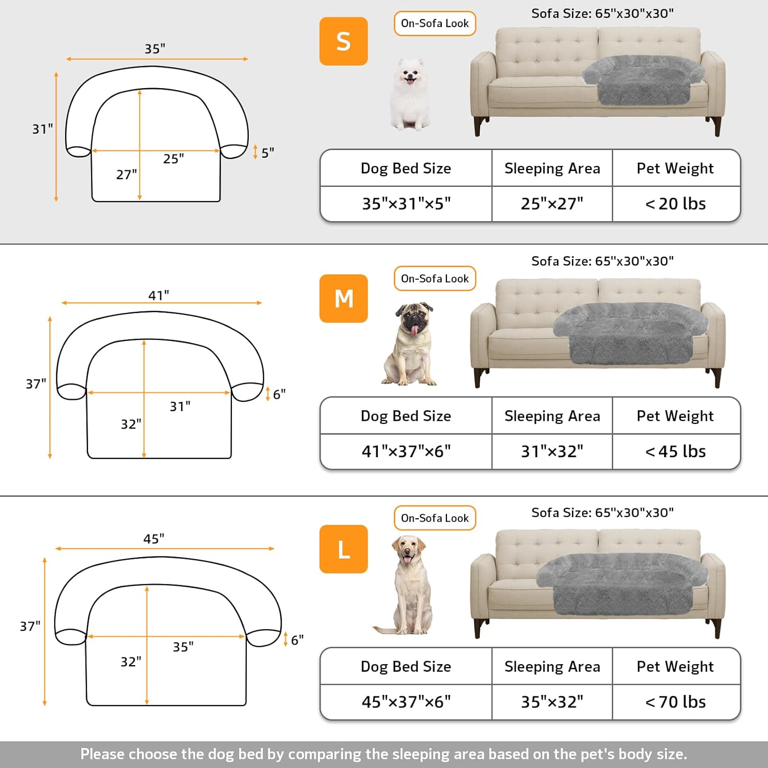 - 【Multiple Size Selection】The couch pet bed has 5 sizes for you to choose from. XS: 31"x23.5" dog bed for small pets. S: 35“x31" dog bed for cats and small dogs. M: 41”x37" dog bed for medium dogs. L: 45“x37" dog bed for large dogs. XL:53"x39" dog bed for large dogs. We have enlarged the sleeping area for pets to give dogs more space.