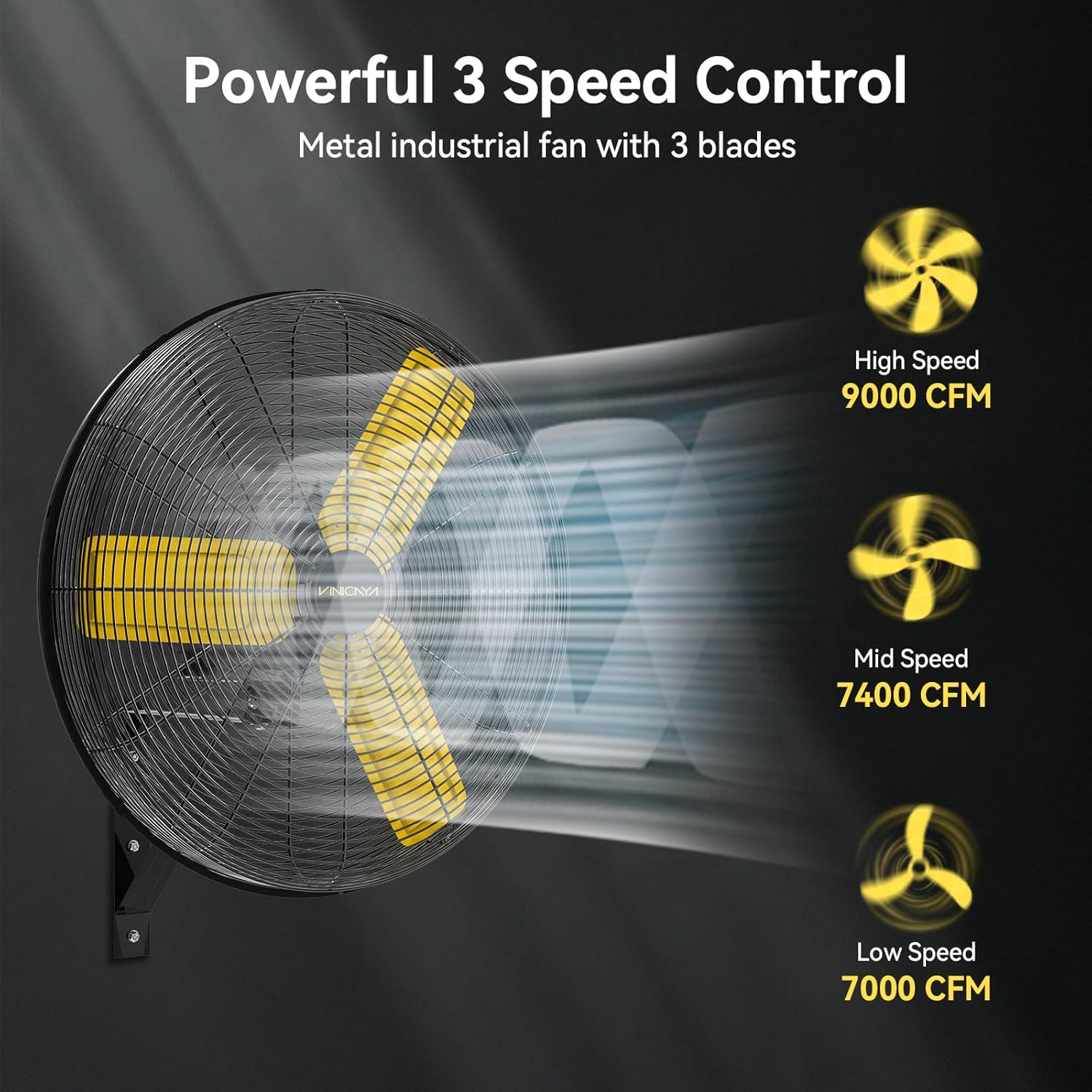 - 3 Speed Control: Offers three speed settings (low-7000 CFM, medium-7400 CFM, and high-9000 CFM) to allow you to customize the airflow intensity based on your specific cooling or ventilation requirements on the wall mount fan