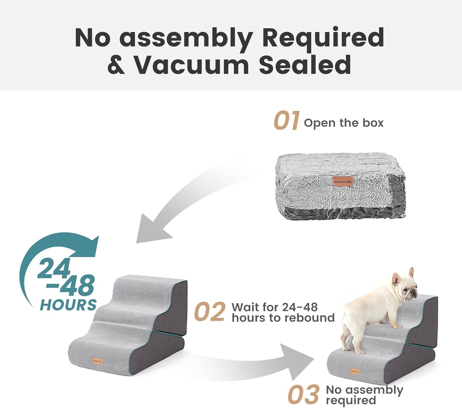• No Assembly Required: The dog stairs for bed is convenient and hassle-free, simply unbox the pet steps, your furry friend can start using it right away. Due to vacuum compression, the surface of the puppy stairs may appear slightly wrinkled, and it will recover within 24-48 hours.