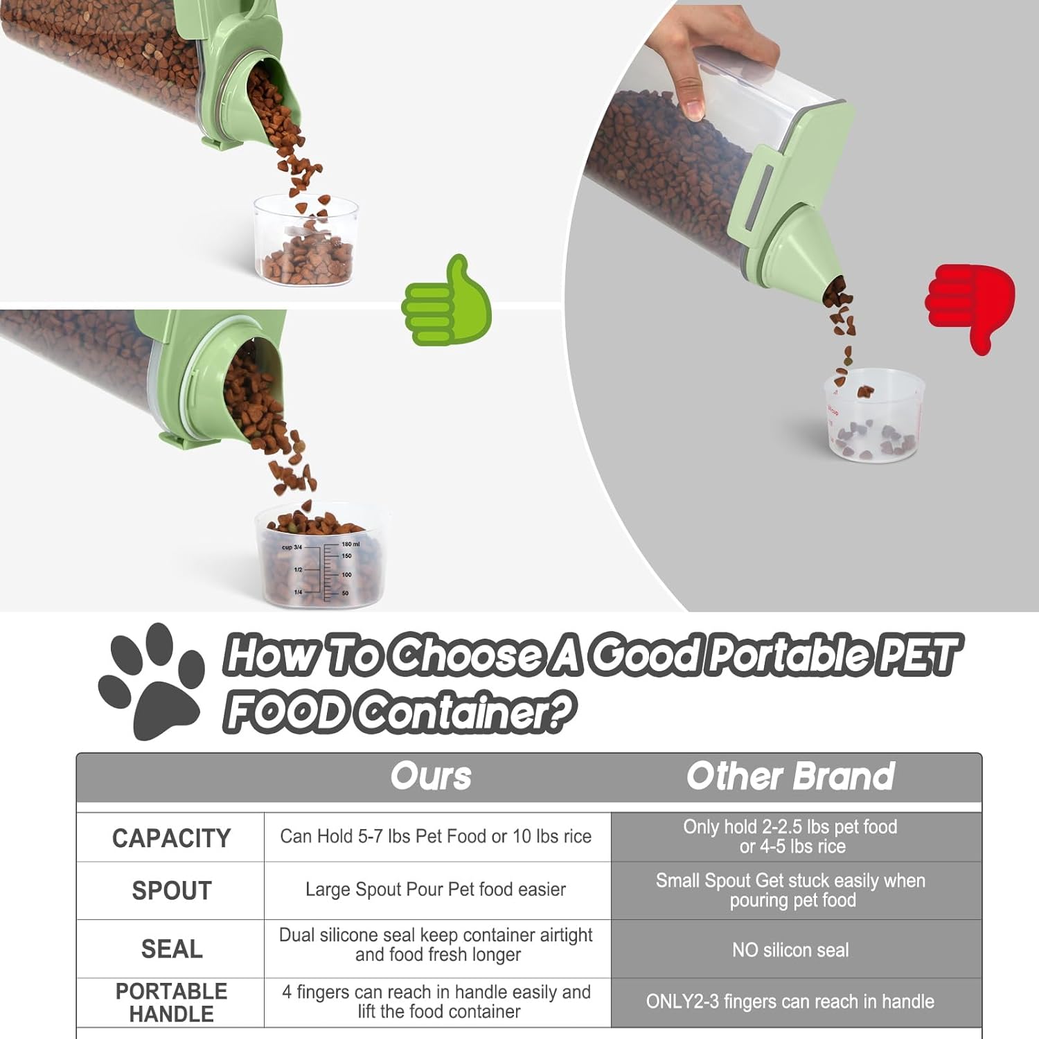 • FUNCTION : This airtight dog food container with portable handle has an airtight design,-has 2 silicone seals and 4 sealing buckles,which can keep your food dry and fresh, the portable handle and large spout design can easily Easily pours food out,also perfect for traveling, hiking, camping or picnicking with your dog