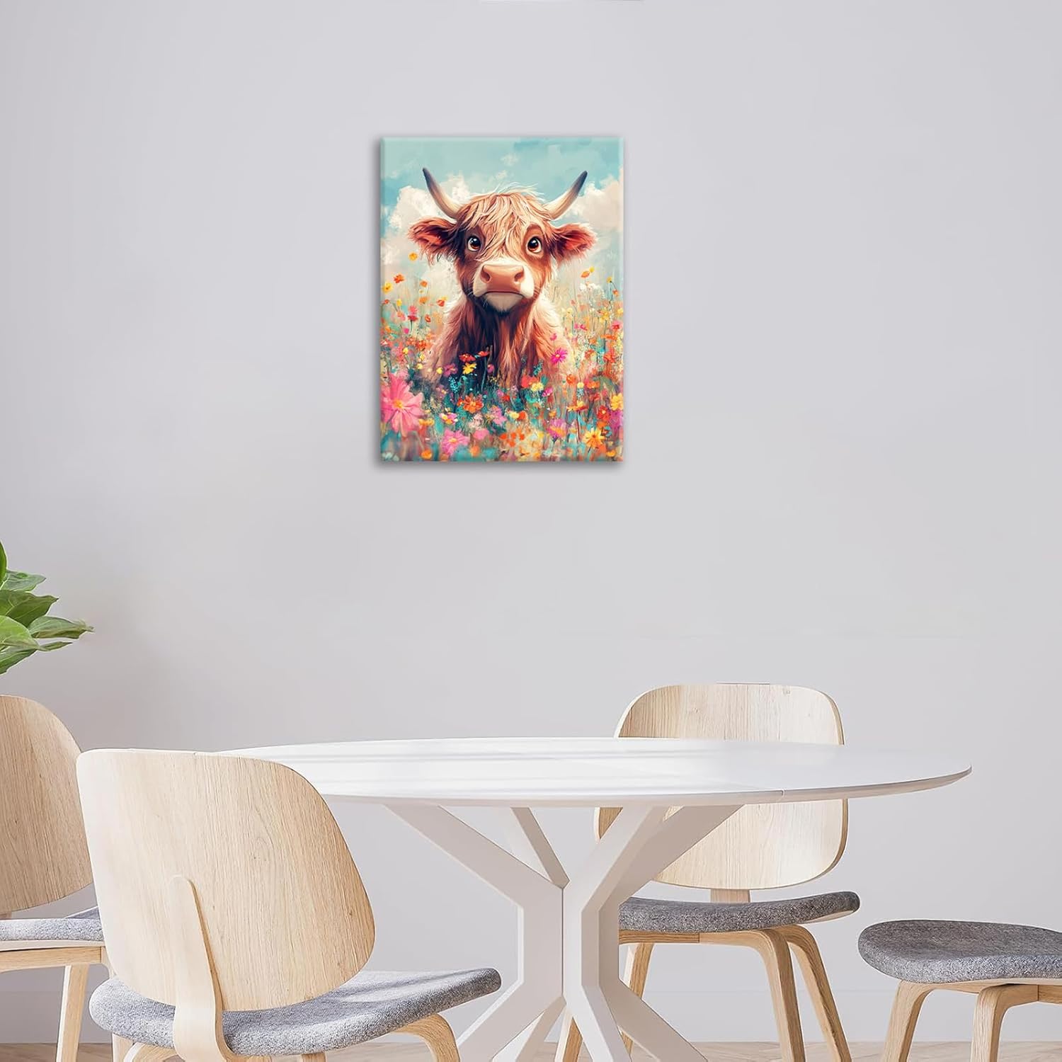 Highland Cow Wall Art Canvas Flower Cattle Wall Decor Prints Framed Painting Animal Pictures Gifts Artwork for Bathroom Living Dining Kitchen 16"x20"