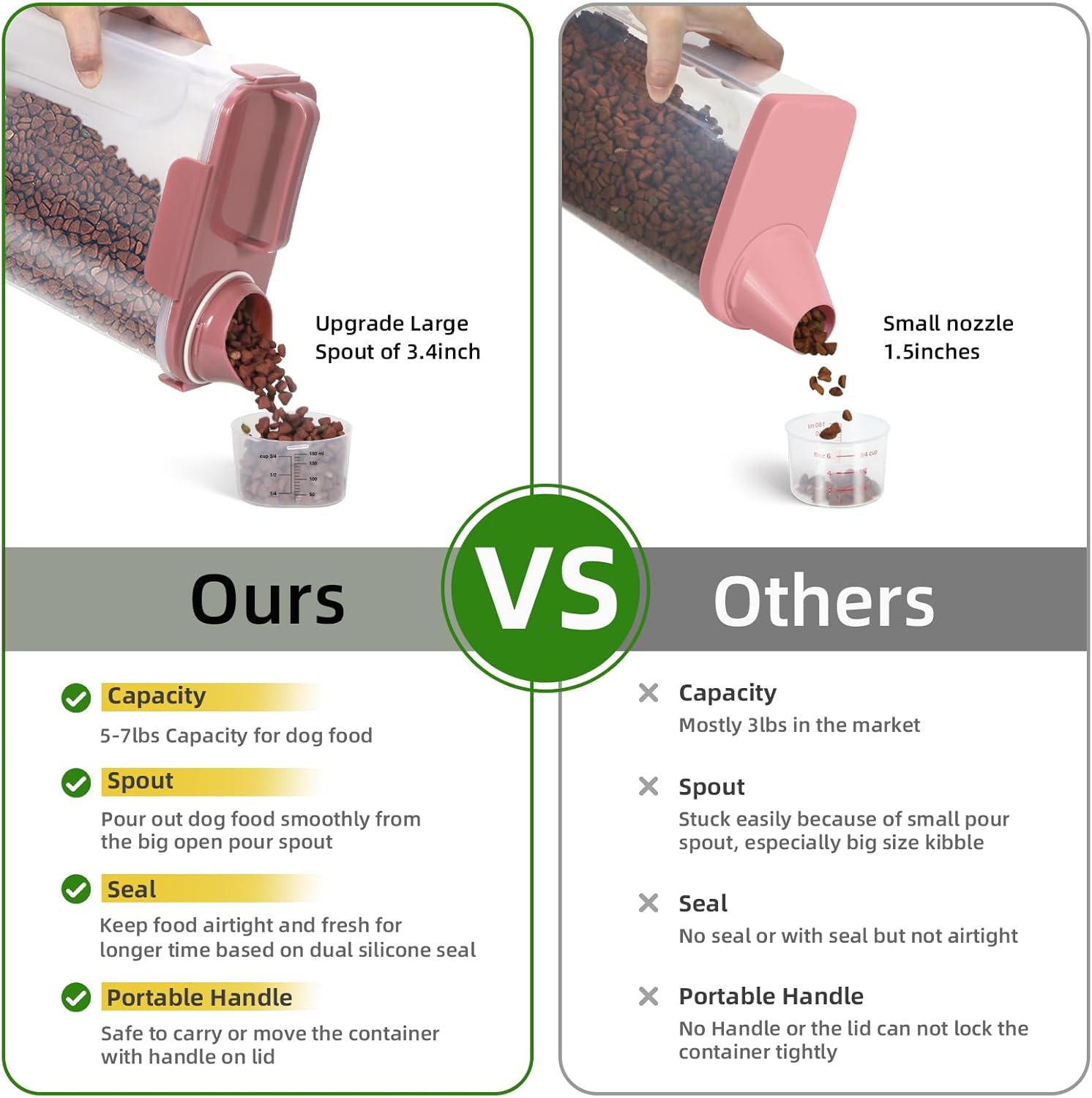 - FUNCTION : This airtight dog food container with portable handle has an airtight design,-has 2 silicone seals and 4 sealing buckles,which can keep your food dry and fresh, the portable handle and large spout design can easily Easily pours food out,also perfect for traveling, hiking, camping or picnicking with your dog