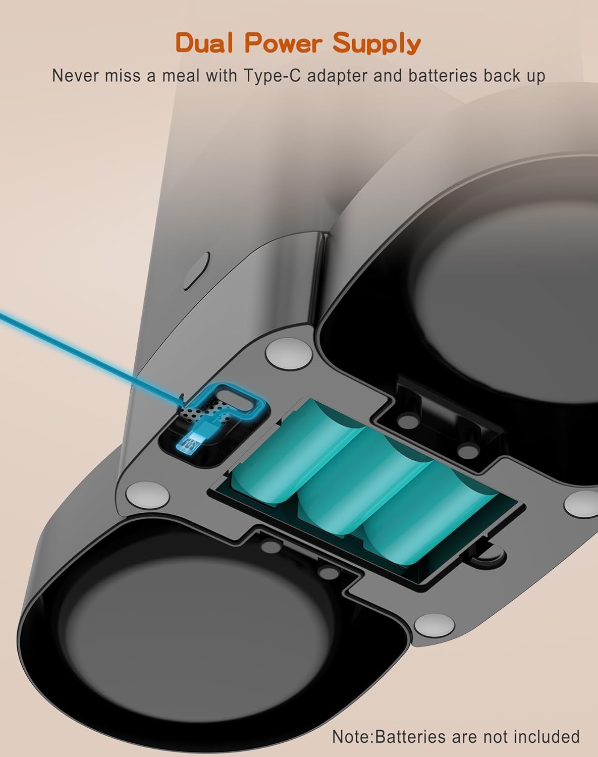 • [Dual Power Supply ] The timed cats feeder can be powered by USB power adapter and 3 alkaline D-size batteries (NOT Included). Once the feeding schedule is set, it is repeated every day. In the event of a power outage, the automatic feeder will automatically switch to battery power. For safety reasons, it is recommended to use Battery power sources. Battery alone can supply power for 200 days.No need to worry about your pet going hungry while you are away.