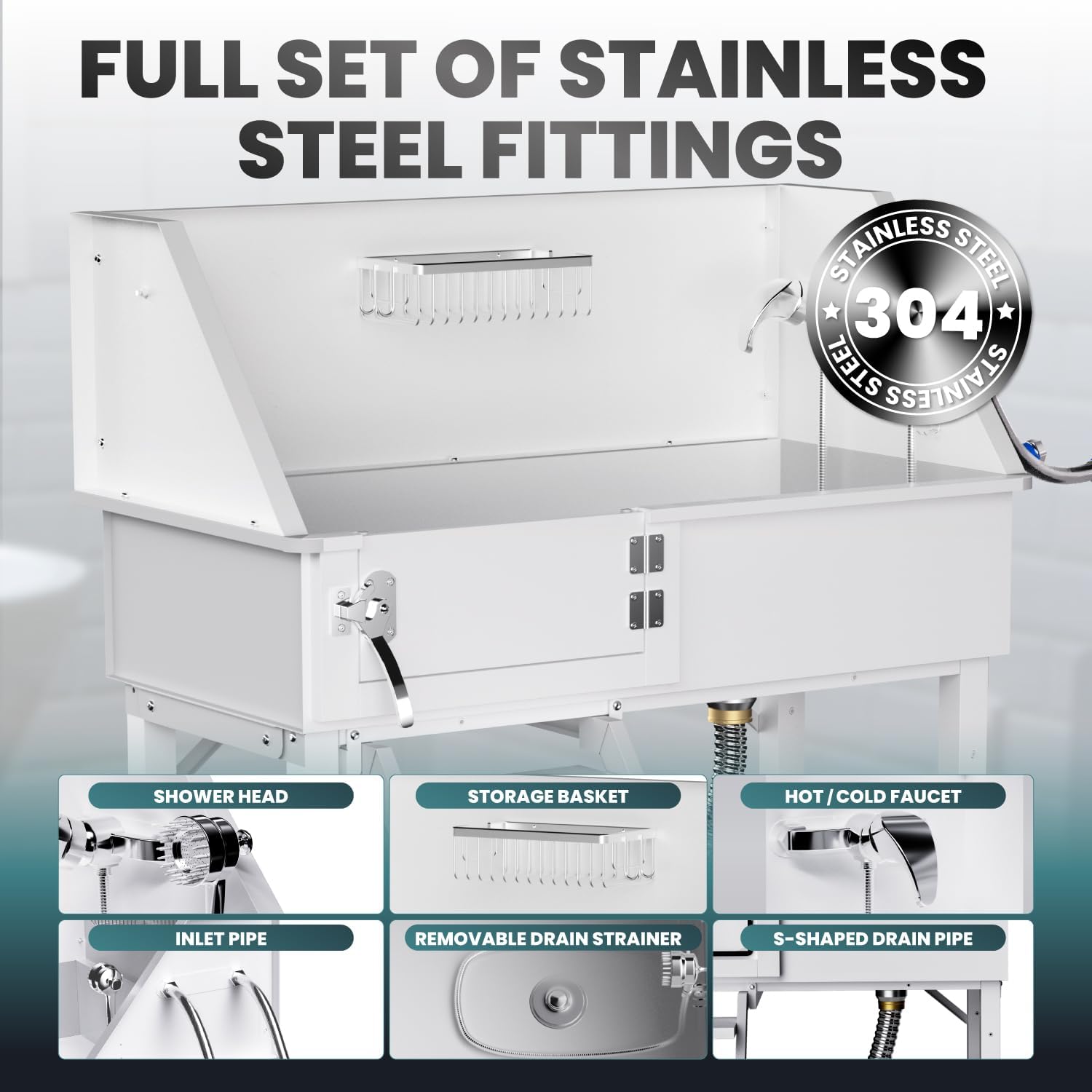 - Perfect Design - The upgraded dog grooming tub with advanced design that make the dog cleaning works more convenient, 1.The bathtubโs shower rack for organized storage, 2.Non-slip stair and adjustable rubber base ensure the safety and stability, 3.Multi-functional faucet for hot and cold water and shower head with comb teeth, 4.Inlet and outlet pipe, S-shaped stainless steel drain pipe for better drainage, A Full Set Grooming Tools At Home!