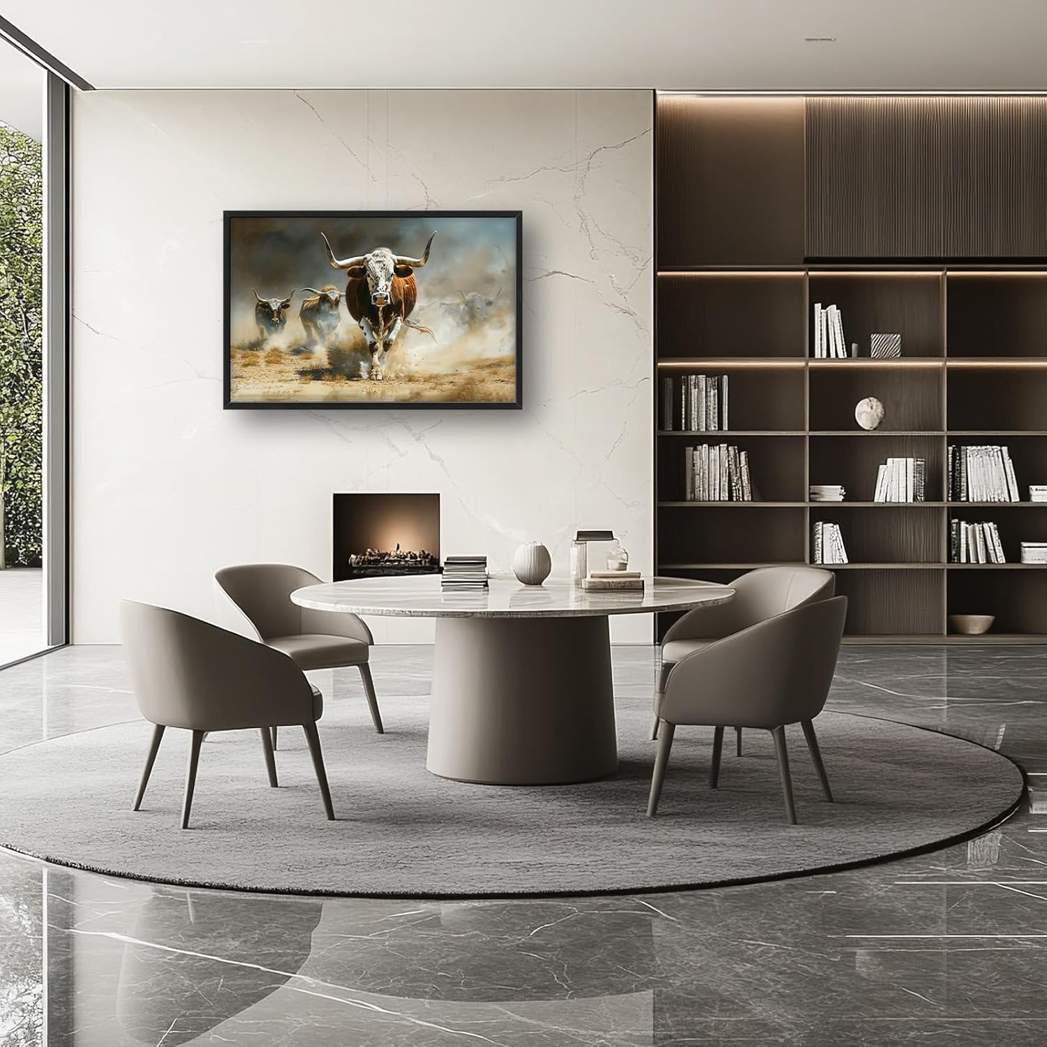 - 【Unique Design】An oil painting of longhorn cattle running through a dusty landscape, realistic and cinematic in style.