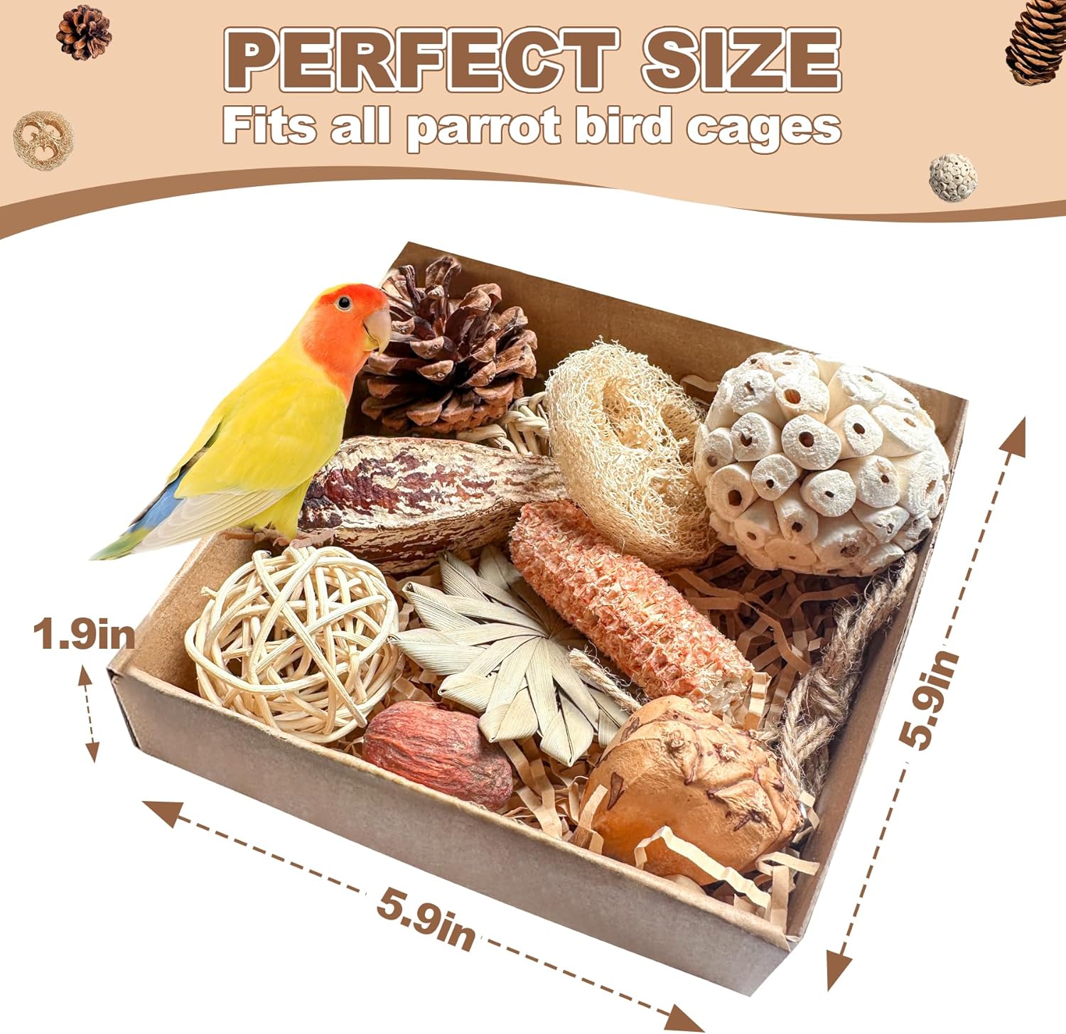 - 🕵️♂️ TREASURE HUNT, TROPICAL EDITION: How use this bird toys for indian ringneck parrots?Hide seeds in pre-drilled starfruit slices, tuck treats into hollowed mountain pineapple husks, or stuff surprises into corn cob crevices. Let your feathered detective sniff out rewards—it’s a beak-powered scavenger hunt!