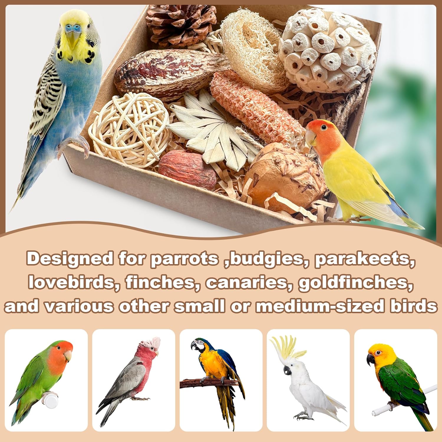 - 🦜 PERFECT FOR EVERY BEAK PERSONALITY: Shredders: Crunchy sunflower leaf discs & tearable grass paper Nibblers: Sweet mango wood & textured palm spirals Tossers: Bouncy sola balls & lightweight Ideal for conures, cockatiels, budgies, and more—no bird left behind!