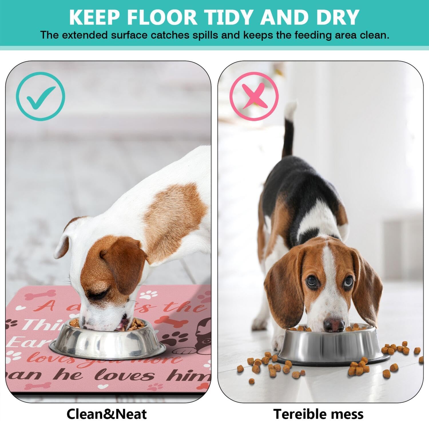- Waterproof & Easy Clean Dog Food Mats for Floors Waterproof - Unlike regular mats, our heavy-duty dog food mat features a 100% waterproof layer that prevents liquids from seeping through the floor. Simply wipe clean your dog bowl mat after meals - no staining or odors! Works great as both a dog food mat and cat food mat.