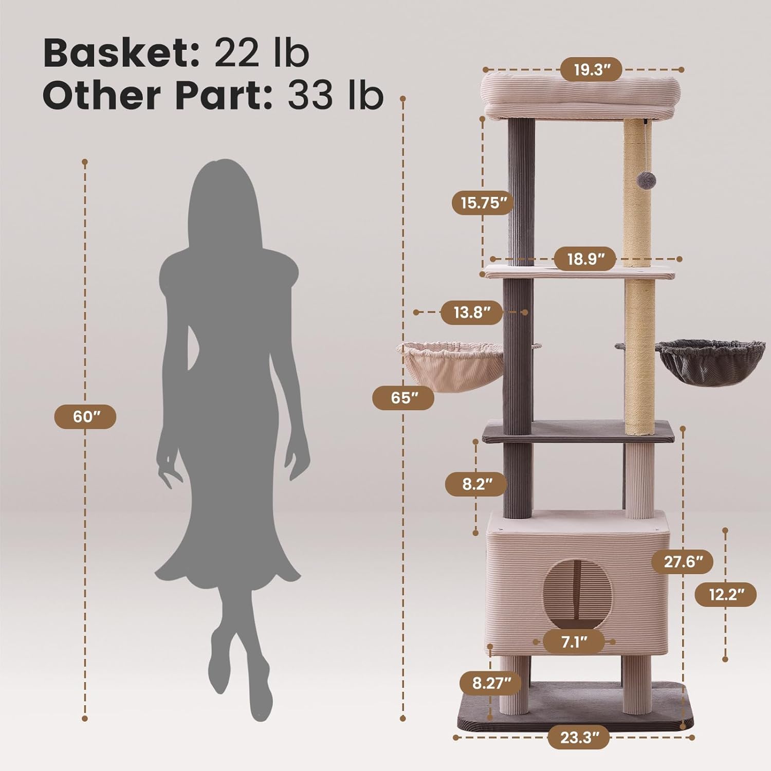Gardner Pet 65in Heavy Duty Cat Tree Tower for Large Cats, Multi-Level Cat Furniture with Replaceable Sisal Scratching Post, Hammock | Extra-Large Platform & Condo Easy to Clean (Corduroy)