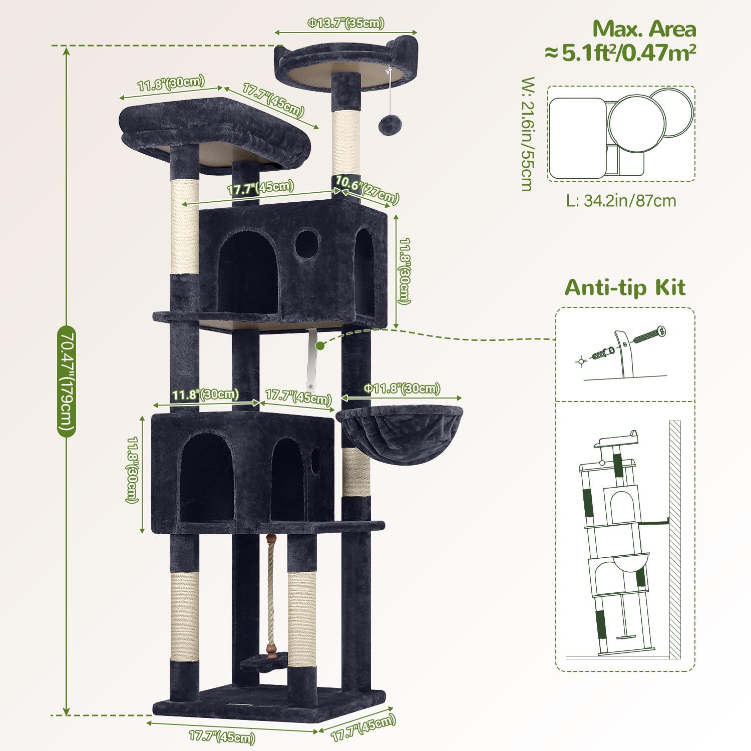 - HEIGHT: Standing at 70 inches tall, this cat tree offers ample space for climbing, meet your cat's needs for climbing, observing, and playing. Allow your cat to explore at different heights, keeping them active and curious