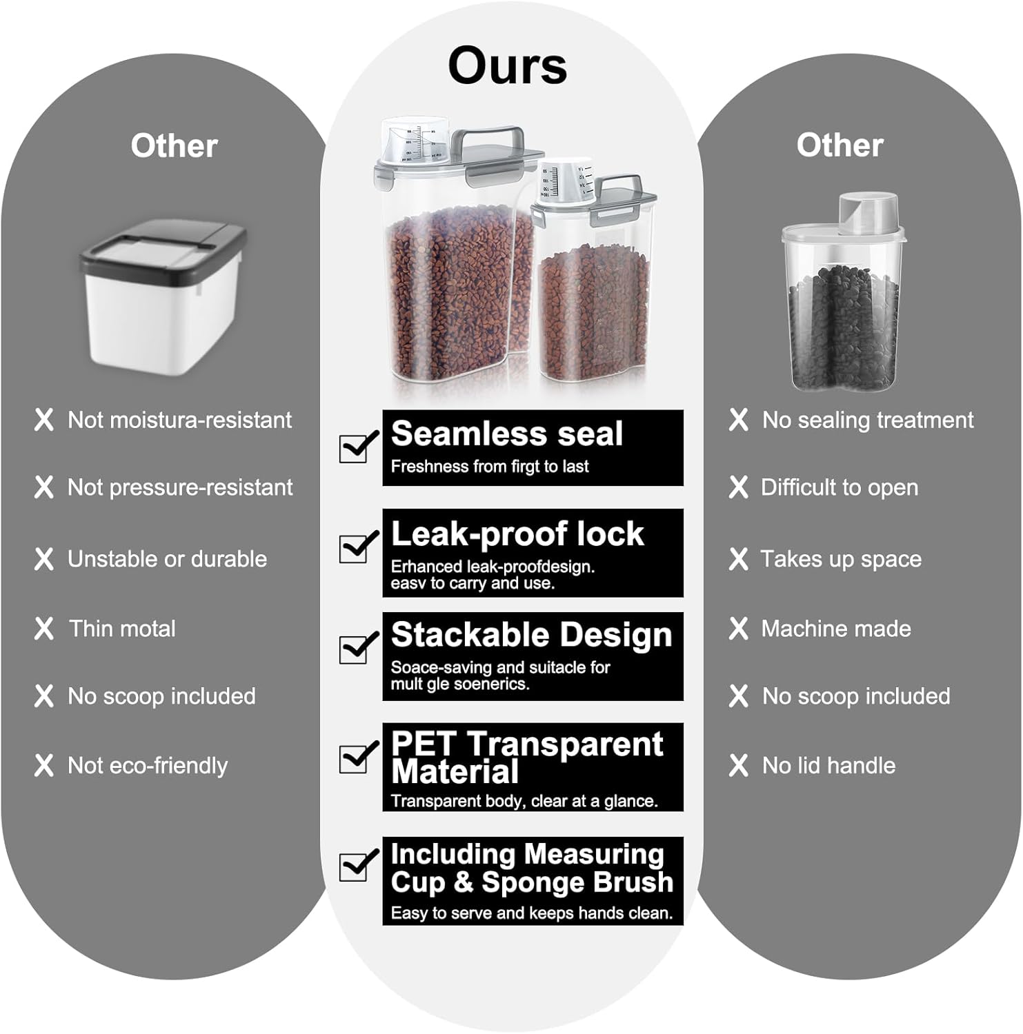 - BENEFITS: Upgraded Large Pour Spout with Measuring Cup-We upgraded the mold so that the pour spout is large enough to pour out large dog food.You can now pour food easily and quickly.The newly upgraded measuring cup can now also be easily screwed onto the nozzle