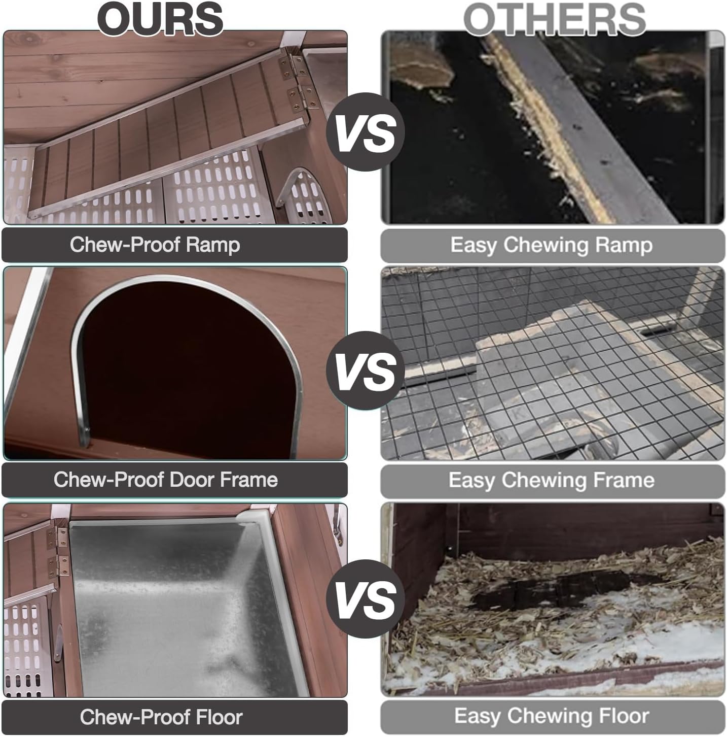 • ANTI CHEWING METAL EDGES Made of solid wood and the ramps, hiding holes and floor frames were reinforced with metal frames to prevent rabbits from gnawing and make the rabbit cages more durable. While being safe and breathable.Give your furry friend a cozy home