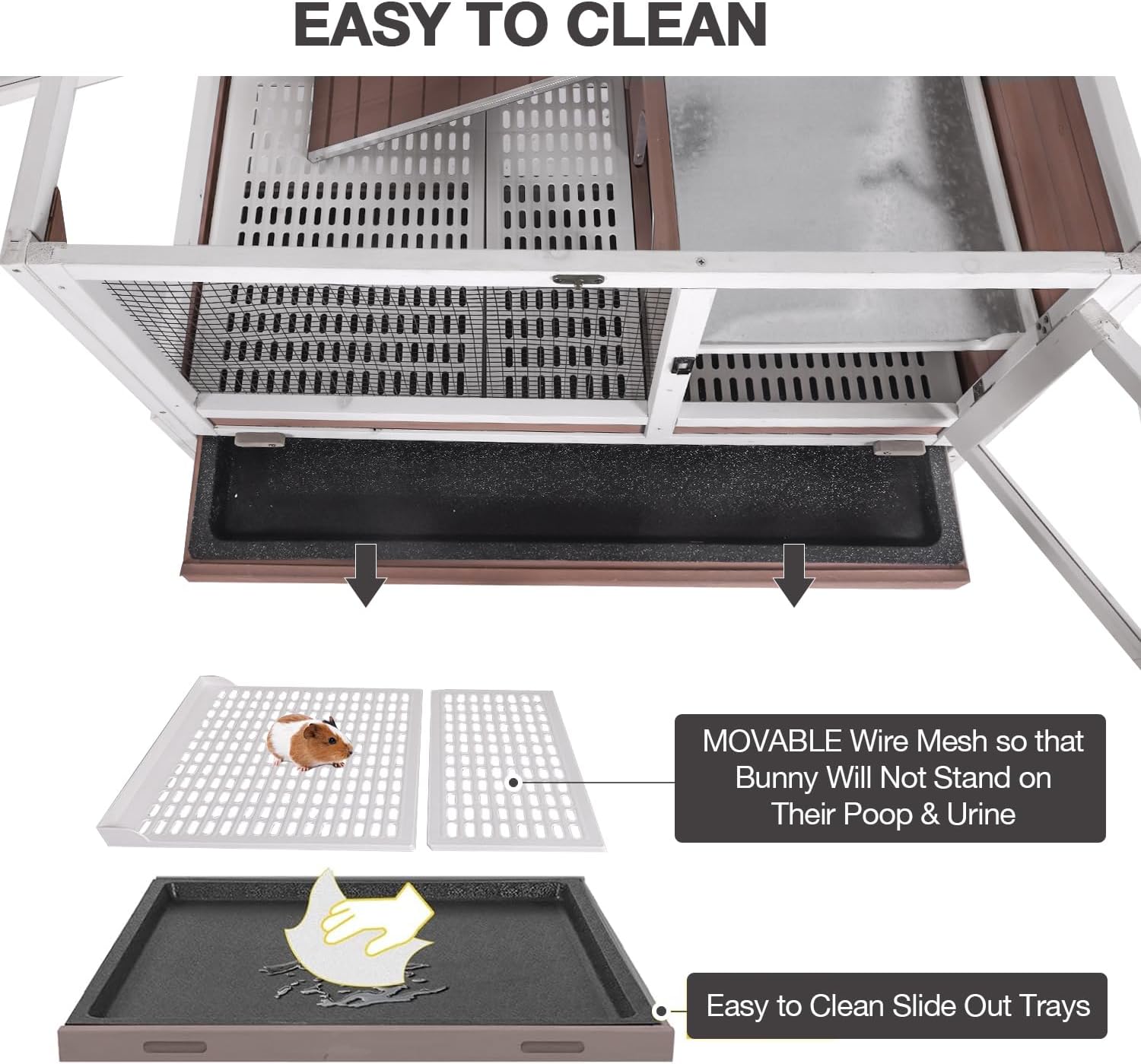 • EASY CLEAN WITH BOTTOM TRAY Our rabbit cage is equipped with a detachable leak-proof tray that can be easily pulled out to clean feces or bedding. There is a metal mesh to prevent rabbits from stepping on excrement. It is equipped with two wooden locks at the same time to prevent the pallet from sliding.Give your furry friend a clean and comfortable home