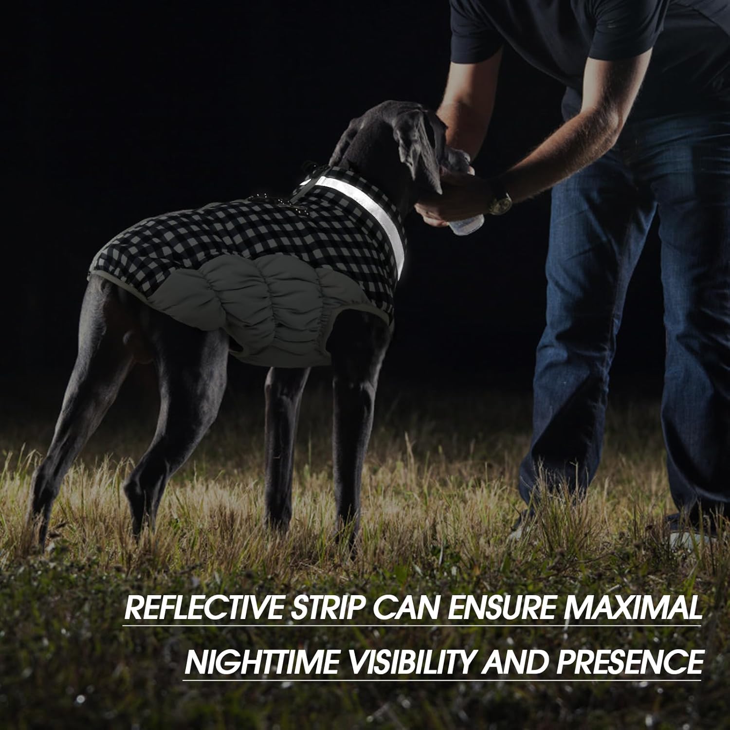 FUAMEY Dog Coat for Large Dogs,Waterproof Dog Winter Jacket with Harness Built in Puppy Cold Weather Coats Reflective Pet Vest with Zipper Warm Fleece Dogs Snowsuit Windproof Checkerboard L