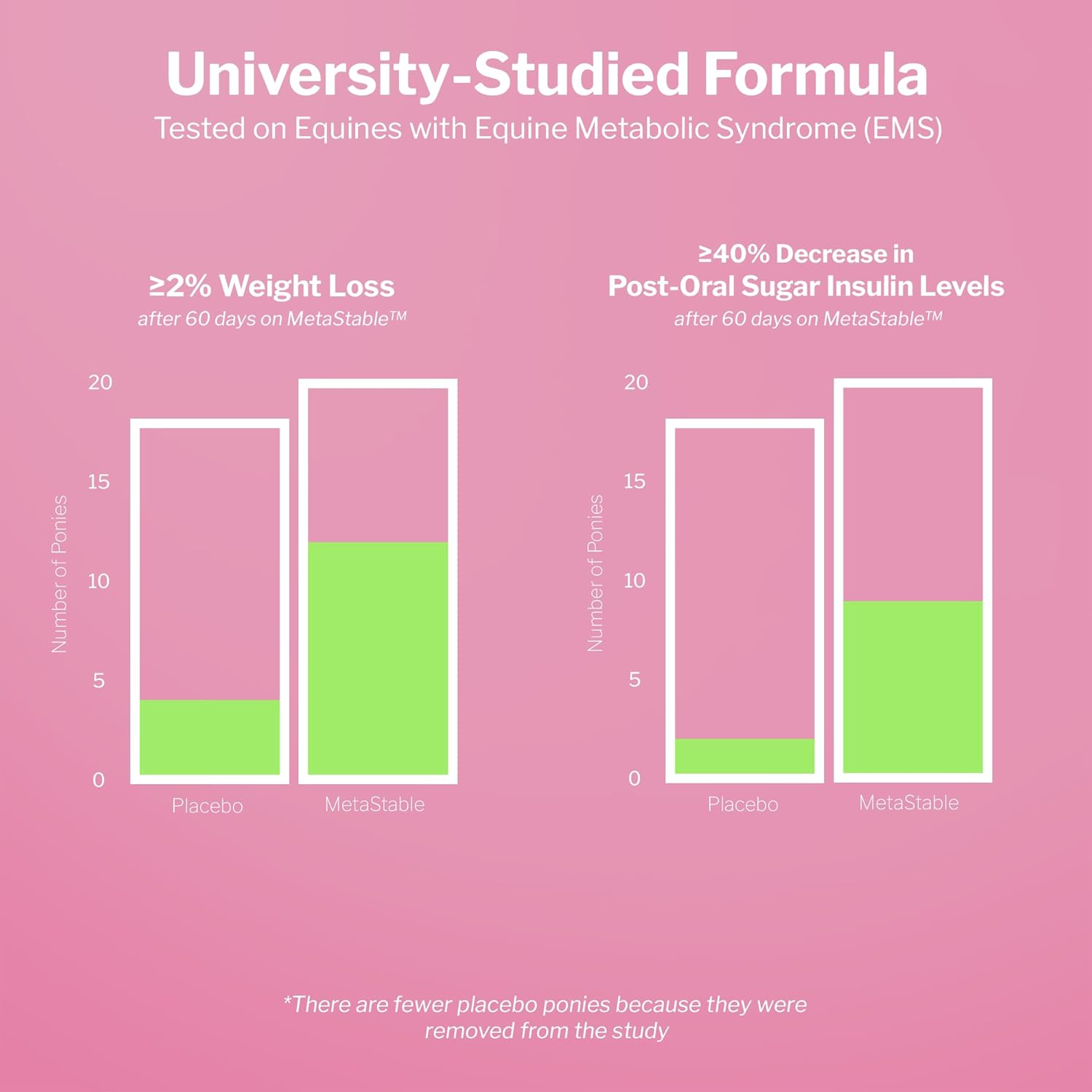 • VETERINARY & UNIVERSITY-STUDIED FORMULA – MetaStable Pellets are backed by research to support horses with Equine Metabolic Syndrome. They were shown to stabilize insulin levels and promote progress towards a healthy weight in just 60 days.