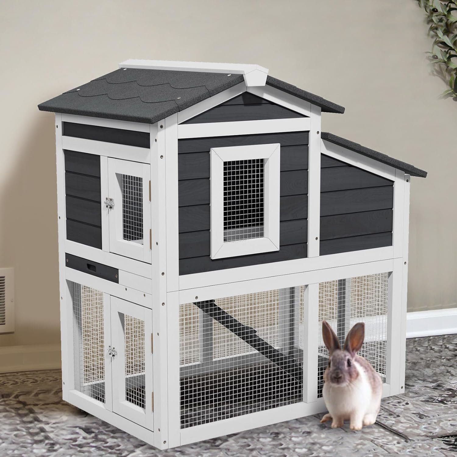 2 Story Rabbit Cage, Weatherproof Rabbit Hutch Indoor & Outdoor, Wooden Guinea Pig Cages with Removable Tray Openable Roof for Small to Medium Animals